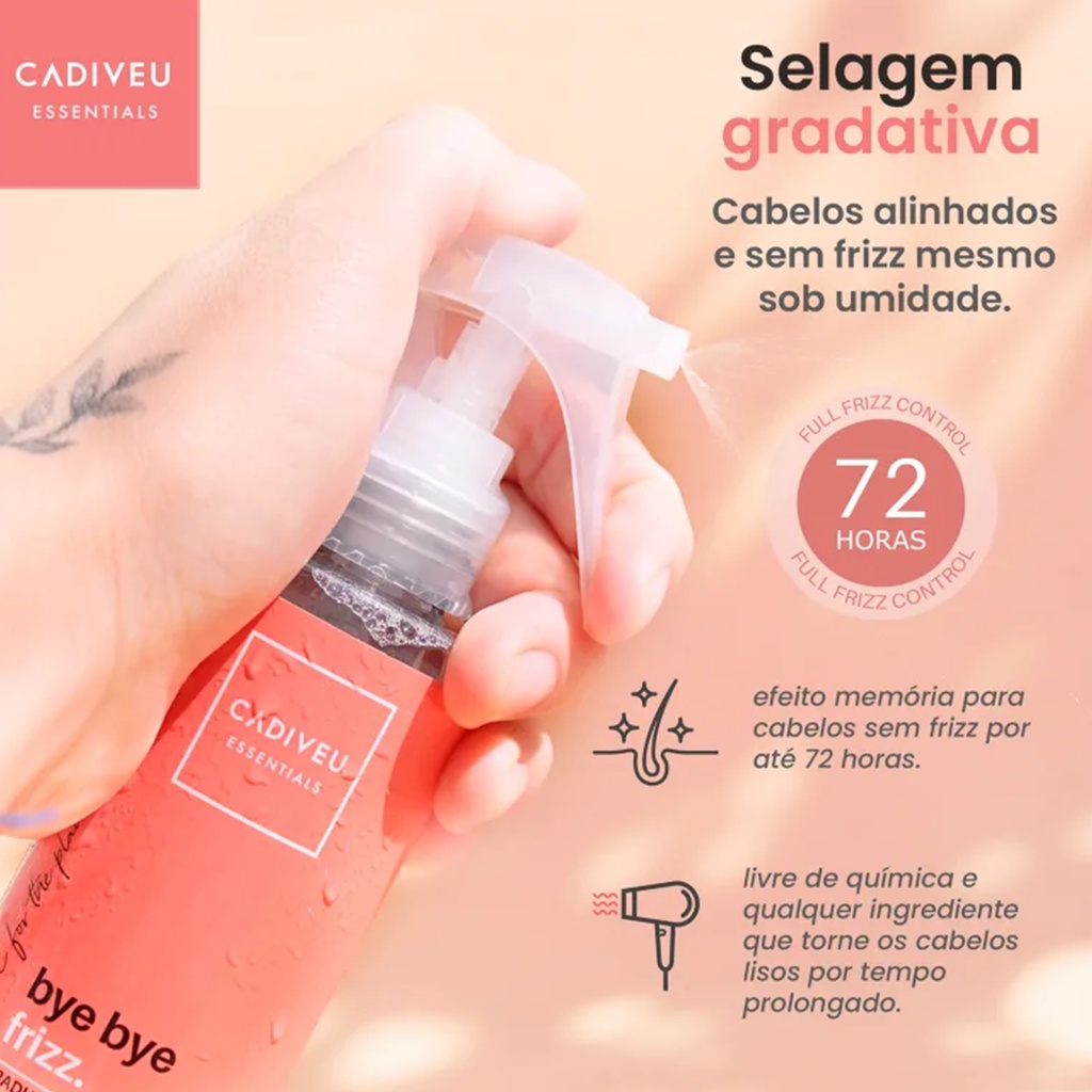 Bye Bye Frizz Spray Protetor Térmico Gradual Smoothing Mist Leave-in alinhador em spray. Cadiveu Professional Essentials Bye Bye Frizz Gradual Smoothing Mist repara danos, melhora a elasticidade e confere proteção térmica. Cadiveu Professional Essentials Bye Bye Frizz Gradual Smoothing Mist alinha os fios de maneira gradual. Em apenas algumas aplicações, sela a cutícula, entrega resultados anti-frizz e repara cabelos danificados por até 72h, mesmo com umidade. Para maior versatilidade e durabilidade dos efeitos, pode ser usado em conjunto com um secador, para finalizar o cabelo da maneira como desejar. Como usar: Borrife o produto nos cabelos levemente umedecidos ou secos e não enxágue. Em seguida, seque e escove normalmente.