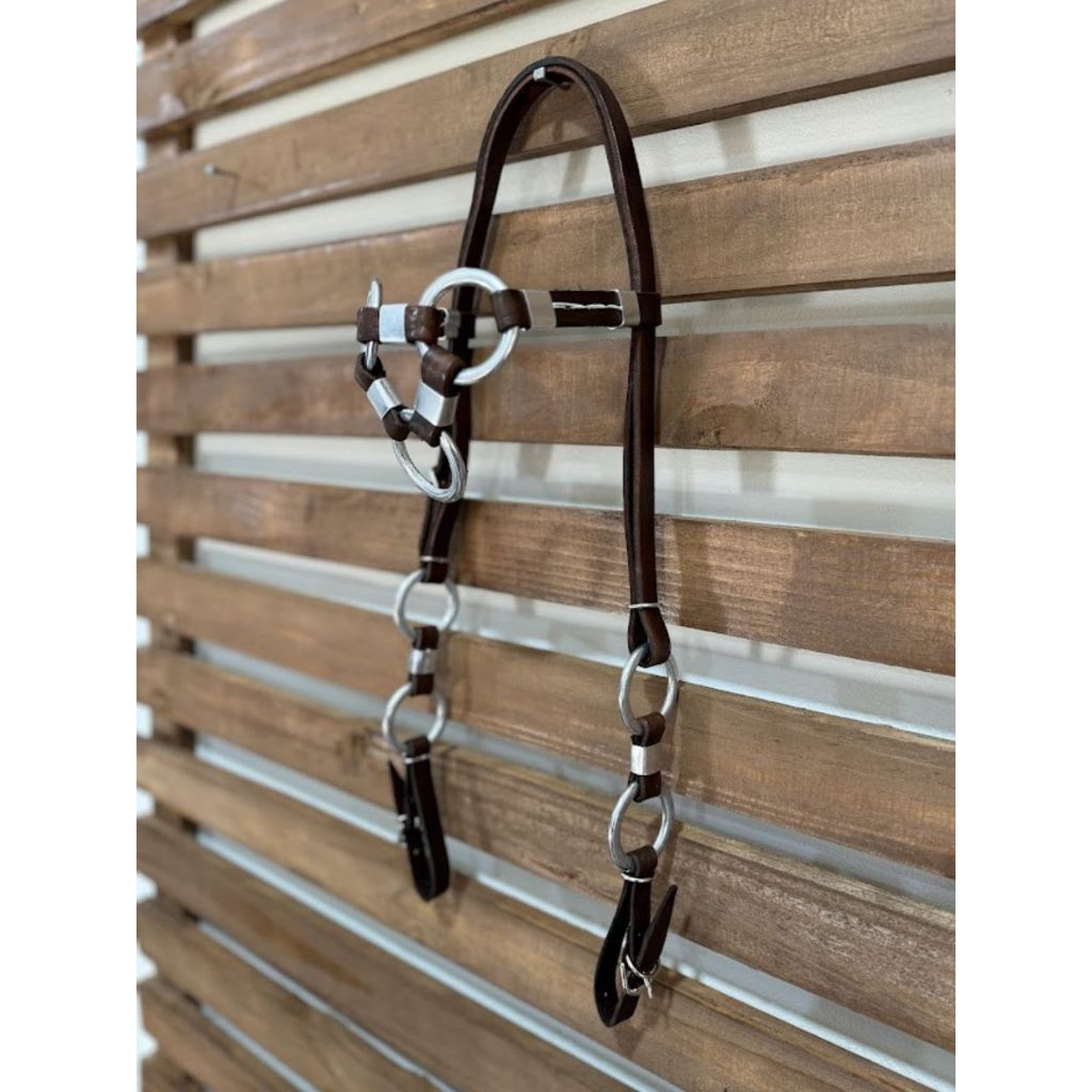 Cabeçada Três Argolas Fabricada em Couro Legítimo Tratado, proporcionando maior resistência e vida útil; Argolas de Alumínio e Fivelas de Metal; Regulagem Lateral; Pode ser usado em todas as raças.