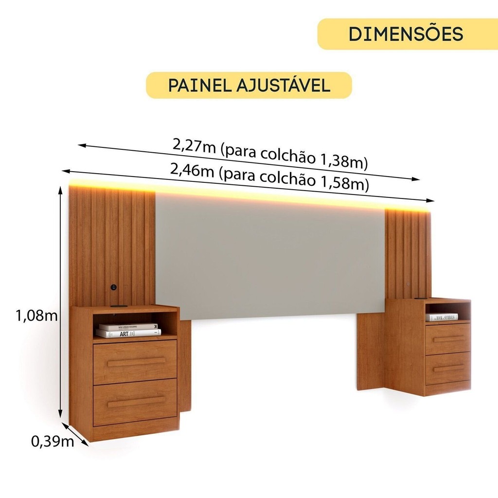 A Solução Completa para o Seu Quarto! Transforme seu quarto em um ambiente moderno e funcional com a Cabeceira Box Casal Ripado com LED e Carregador USB e 4 Gavetas 246cm x 108cm Espresso Móveis. Ela é a escolha perfeita para quem busca unir tecnologia, estética e praticidade em um único móvel. Design, Luz e Conectividade em Destaque : Esta cabeceira se harmoniza com diversos estilos de decoração, graças ao seu elegante painel ripado e aos puxadores em MDF. Os detalhes que fazem a diferença são: Iluminação Aconchegante: A iluminação de LED em cor quente cria uma atmosfera suave e convidativa, realçando a beleza do móvel e tornando o ambiente mais íntimo e personalizado. Carregamento ao Seu Alcance: As entradas USB integradas nas mesas de cabeceira permitem que você carregue seus dispositivos eletrônicos com total praticidade, sem precisar se levantar. Organização e Funcionalidade para o Dia a Dia : A Cabeceira Box Casal Ripado não é só bonita, ela é extremamente funcional e foi pensada para otimizar seu espaço: Adaptação Perfeita: Com largura regulável de 227cm a 246cm, ela se adapta a colchões de 138cm e 158cm, garantindo um visual harmonioso com sua cama. Espaço de Sobra: As 4 gavetas com corrediças telescópicas e profundidade de 39cm oferecem o espaço ideal para guardar objetos pessoais e o que você precisa ter sempre à mão. Design Robusto: Produzida em MDP e MDF, a cabeceira garante um acabamento sofisticado e a durabilidade que você busca em um móvel. A Cabeceira Box Casal Ripado une estética e funcionalidade para trazer conforto, beleza e organização ao seu quarto. Importante: Cama e colchão não acompanham o produto. Fonte de Energia não inclusa. Peso (kg): 43.4 Garantia: 03 Meses Altura (cm): 108 Acabamento: Pintura UV Extensível: Sim Largura (cm): 246 Possui Baú: Não Possui LED: Sim Possui Pés: Não Fixação Box: Não Possui Vidro: Não Largura Máxima: 2.46 Largura Mínima: 2.27 Possui Gavetas: Sim Possui Espelhos: Não Profundidade (cm): 39 Tamanho da Cama: Casal/Queen Escala de Brilho: Fosco Fixação na Parede: Não Origem do Produto: Nacional Ambiente Principal: Quarto Cabeceira Estofada: Não Material Principal: MDP Possui Entrada USB: Sim Tecido Predominante: Não Possui Quantidade de Espelhos: Não Possui Mesa de Cabeceira: 2 Revestimento da Cabeceira: Não Possui Largura do Colchão Indicado: 138cm/158cm Material da Mesa de Cabeceira: MDP Acabamento da Mesa de Cabeceira: Pintura Informações Complementares (Novo): Produto com Led e Entrada USB Escala de Brilho da Mesa de Cabeceira: Fosco Marca: Espresso Móveis Cor do Produto: Cinamomo/Off White Itens Inclusos: 1 Painel, 2 Mesas de Cabeceira, Kit de Ferragem e Manual de Montagem Cor Predominante: Marrom Linha ou Coleção: Ripado