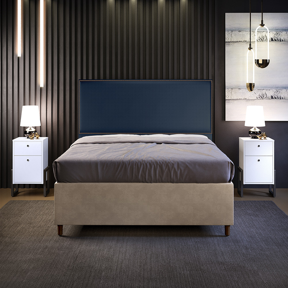 A Cabeceira Cama Box Casal Com Tachas 140 cm Vicenza L02 Facto Azul Marinho - Lyam Decor vai trazer ainda mais elegância ao seu quarto! Todos os detalhes foram pensados para criar uma atmosfera de aconchego e tranquilidade. Produzida com materiais de excelente qualidade e acabamento impecável, o revestimento em Facto combina majestosamente com as tachas decorativas. Pode ser disposta com mesas de cabeceira e apoio, calçadeira ou recamier, valoriza seu ambiente e cria um match perfeito em qualquer composição. Você merece o melhor, garanta já a sua!! Dimensões do produto (L x A x P) 140 x 127 x 8 cm Altura do chão à base: 66 cm Diâmetro da tacha decorativa: 9,5 mm Dimensões do suporte frame (L x A x P) 5,5 x 13,5 x 16,5 cm Características: Estrutura em madeira reflorestada. Revestimento em tecido Facto na cor Azul Marinho. Acabamento em fita de tachas de ferro galvanizado, na cor Fumê. Densidade da Espuma D-18. Acompanha todos os acessórios para fixação. Acompanha suporte frame produzido em chapa de ferro com acabamento em esmalte PU na cor alumínio. Possui sapatas plásticas. Características do Frame: Produzido em chapa de ferro 1,5 mm. Acabamento em esmalte PU na cor Alumínio. Acessórios para fixação: 04 Parafusos cabeça chata auto atarraxantes 5,0x25mm e 04 arruelas 1/4. - Por se tratar de estofado as medidas podem ter uma pequena variação de até 3 cm. - A tonalidade do produto real poderá ter ligeira variação devido o lote de tecidos. - A limpeza deve ser feita com pano levemente umedecido em água limpa, sem esfregar, não utilizar produtos abrasivos, desengordurantes, álcool ou solvente. Observações importantes: - Produto para uso residencial em ambiente interno, não devendo ficar exposto diretamente ao sol, calor e umidade excessivos. - Pode haver alguma diferença de tonalidade entre a imagem e o produto real, por conta do tratamento de imagens e a calibração de cores do seu monitor. - As imagens são meramente ilustrativas, não acompanham objetos de decoração e eletrônicos. - Ao receber a mercadoria, o cliente deve verificar as condições da embalagem, caso haja alguma avaria não assine o comprovante de recebimento. - Montagem, desmontagem e outras instalações serão de responsabilidade do cliente. Não nos responsabilizamos, no ato da entrega, por subir escadas/elevadores ou pelo transporte por guincho em apartamentos. Eventuais despesas são de responsabilidade do comprador. - Confira as dimensões do produto e certifique-se de que passará normalmente por supostos elevadores, portas, escadas e/ou corredores de sua residência.