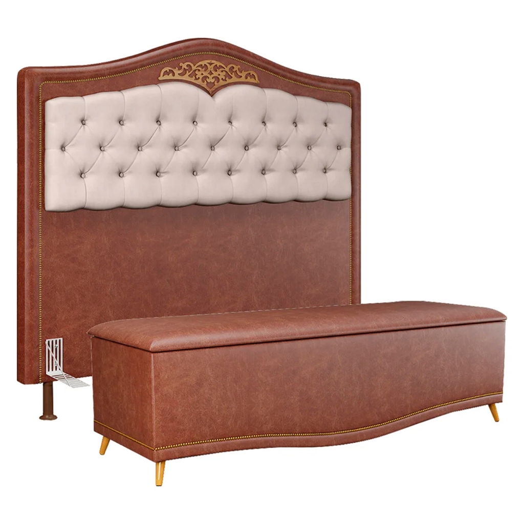 A Cabeceira Cama Box Casal Queen 160cm Com Calçadeira Baú Imperial J02 Facto Marrom/Bege, da Mpozenato, é uma ótima opção para quem busca conforto e elegância no ambiente! Capazes de fazer toda a diferença no quarto em questão de decoração, conforto e organização. Possuem um design moderno e elegante, detalhes de botonê e contorno em tachas na cor fumê que dão um toque de sofisticação ao ambiente. A Cabeceira acompanha frame para fixação no box e a Calçadeira baú possui amplo espaço interno para guardar roupas de cama, sapatos e outros itens essenciais para deixar seu quarto com uma organização impecável. O Kit Cabeceira e Calcadeira é produzido em material resistente e durável que garante qualidade e beleza ao seu móvel. Ou seja, peças fundamentais para compor o seu quarto com estilo e praticidade! Gostou? Adicione em seu carrinho de compras agora mesmo! ESPECIFICAÇÕES Dimensões do Produto (L x A x P) Cabeceira: 160 x 126 x 11 cm. Calcadeira: 160 x 56 x 50 cm. Peso: Cabeceira 13 Kg/ Calcadeira 27 Kg. Outras Medidas: Ideal para Colchão de 88 cm. Características do Produto Material da Estrutura: Madeira de Eucalipto. Material da Espuma: Poliuretano. Revestimento: Facto. Possui Pés: Sim. Material dos Pés: PVC/Madeira. Possui Frame: Sim. Diferenciais: - Botonês Revestidos. - Tachinhas na cor fumê. - Espuma de alta qualidade. - Design moderno. - Costura resistente. - Madeira de reflorestamento. - Acompanha parafusos para fixação. Sistema de Montagem: O produto é enviado montado, sendo necessário apenas a fixação dos pés e parafusar a cabeceira na cama box. Manual de Montagem: Não. Complexidade da Montagem: Baixa. Conteúdo da Embalagem: 1 Cabeceira/ 1 Calcadeira. Volumes: 2 Volumes. Garantia do Fabricante: 90 dias contra defeito de fabricação. Montagem: Recomendamos que seja feita por um profissional. Recomendação de Limpeza: Utilize pano levemente úmido. Informação Relevante: - Pode haver ligeira variação entre a cor do produto real e a imagem anunciada devido o lote de tecidos. - Por se tratar de estofado, as medidas podem ter uma pequena variação em até 3 cm. Observações importantes - Produto para uso residencial em ambiente interno, não devendo ficar exposto diretamente ao sol, calor e umidades excessivas. - Pode haver alguma diferença de tonalidade entre a imagem e o produto real, por conta do tratamento de imagens e a calibração de cores do seu monitor. - As imagens são meramente ilustrativas, não acompanham objetos de decoração e eletrônicos. - Confira o estado da embalagem, não devendo assinar o comprovante em caso de danos. - Não asseguramos, no ato da entrega, por subir escadas/elevadores, pelo transporte por guincho em apartamentos ou montagem, desmontagem e instalações. Eventuais despesas são por conta do comprador. - Confira as dimensões do produto e certifique-se de que passará normalmente por supostos elevadores, portas, escadas e/ou corredores de sua residência.