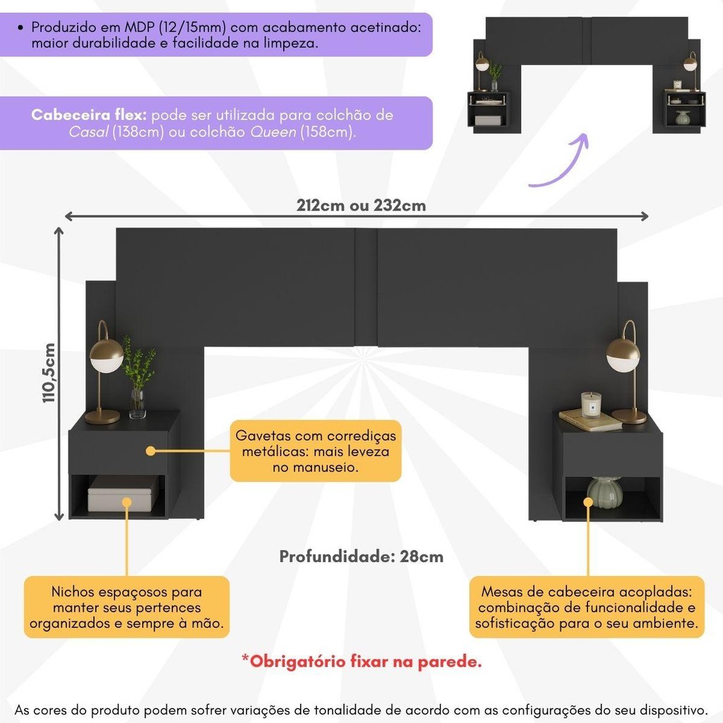 Dê um toque de estilo e praticidade ao seu quarto com a Cabeceira Casal/Queen com 2 Mesas de Cabeceira 232cm Multimóveis MP4317, o complemento perfeito para transformar o ambiente. Durabilidade e sofisticação: Produzida em MDP (12/15mm) com acabamento acetinado (cerca de 20% de brilho), a cabeceira oferece resistência e praticidade na limpeza do móvel. Seu design de linhas retas traz um ar de sofisticação e contemporaneidade ao ambiente. Funcionalidade e organização: A cabeceira ajustável pode ser utilizada com colchões de Casal (138cm) ou Queen (158cm), garantindo um encaixe perfeito em qualquer decoração. As 2 mesas de cabeceira acopladas possuem nichos e gavetas com corrediças metálicas, para uma abertura suave, proporcionando amplo espaço para manter seus objetos organizados e sempre ao alcance. Conteúdo da Embalagem: 1 (uma) Cabeceira com 2 Mesas de Cabeceira Kit Ferragem Manual de Montagem Especificações Técnicas: Altura: 110,5cm | Largura: 212 ou 232cm | Profundidade: 28cm Material: MDP (12/15mm) Acabamento: Acetinado Tamanho ajustável: Sim Possui mesas de cabeceira: Sim Quantidade de gavetas: 2 Corrediças: Metálicas *Você pode consultar as medidas detalhadas na imagem técnica do produto. *As cores do produto podem sofrer variações de tonalidade de acordo com as configurações do seu dispositivo. *Obrigatório fixar a cabeceira na parede. Aqui na Loja Multimóveis, você pode concluir sua compra facilmente com toda segurança. A entrega é garantida e aqui você está em 1° lugar. Imagem meramente ilustrativa. Decoração e cama não acompanham o produto. O produto será entregue desmontado e não disponibilizamos o serviço de montagem.