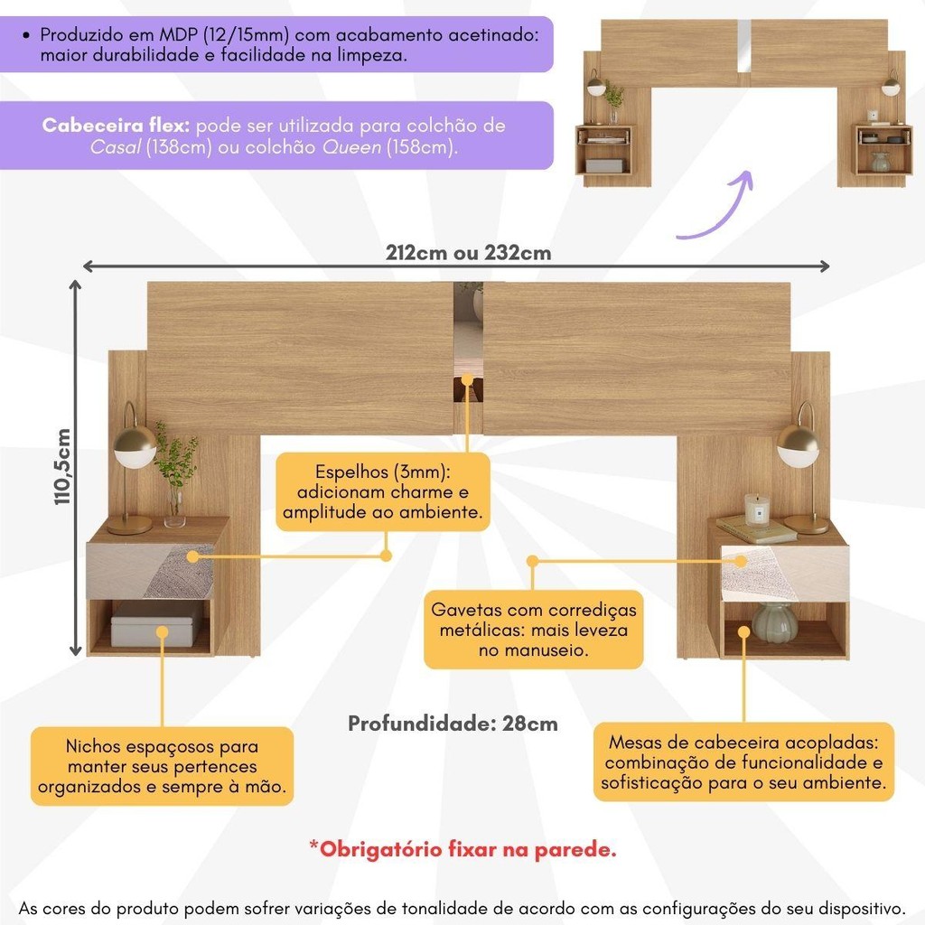 Dê um toque de estilo e praticidade ao seu quarto com a Cabeceira Casal/Queen com Espelhos e 2 Mesas de Cabeceira 232cm Multimóveis MP4326, o complemento perfeito para transformar o ambiente. Durabilidade e sofisticação: Produzida em MDP (12/15mm) com acabamento acetinado (cerca de 20% de brilho), a cabeceira oferece resistência e praticidade na limpeza do móvel. Seu design de linhas retas traz um ar de sofisticação e contemporaneidade ao ambiente. Funcionalidade e organização: A cabeceira ajustável pode ser utilizada com colchões de Casal (138cm) ou Queen (158cm), garantindo um encaixe perfeito em qualquer decoração. As 2 mesas de cabeceira acopladas possuem nichos e gavetas com corrediças metálicas, para uma abertura suave, proporcionando amplo espaço para manter seus objetos organizados e sempre ao alcance. Além disso, as gavetas e o painel contam com espelhos de vidro (3mm) lapidados, ou seja, não possuem bordas cortantes, oferecendo elegância ao ambiente e total segurança no manuseio. Conteúdo da Embalagem: 1 (uma) Cabeceira com 2 Mesas de Cabeceira e Espelhos Kit Ferragem Manual de Montagem Especificações Técnicas: Altura: 110,5cm | Largura: 212 ou 232cm | Profundidade 28cm Material: MDP (12/15mm) Acabamento: Acetinado Tamanho ajustável: Sim Possui espelhos: Sim Possui mesas de cabeceira: Sim Quantidade de gavetas: 2 Corrediças: Metálicas *Você pode consultar as medidas detalhadas na imagem técnica do produto. *As cores do produto podem sofrer variações de tonalidade de acordo com as configurações do seu dispositivo. *Obrigatório fixar a cabeceira na parede. Aqui na Loja Multimóveis, você pode concluir sua compra facilmente com toda segurança. A entrega é garantida e aqui você está em 1° lugar. Imagem meramente ilustrativa. Decoração e cama não acompanham o produto. O produto será entregue desmontado e não disponibilizamos o serviço de montagem.