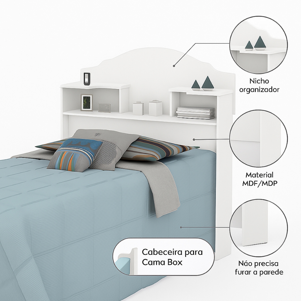 Cabeceira de Cama Solteiro Box Evelyn 90cm Com Nichos Prateleiras Organizadores