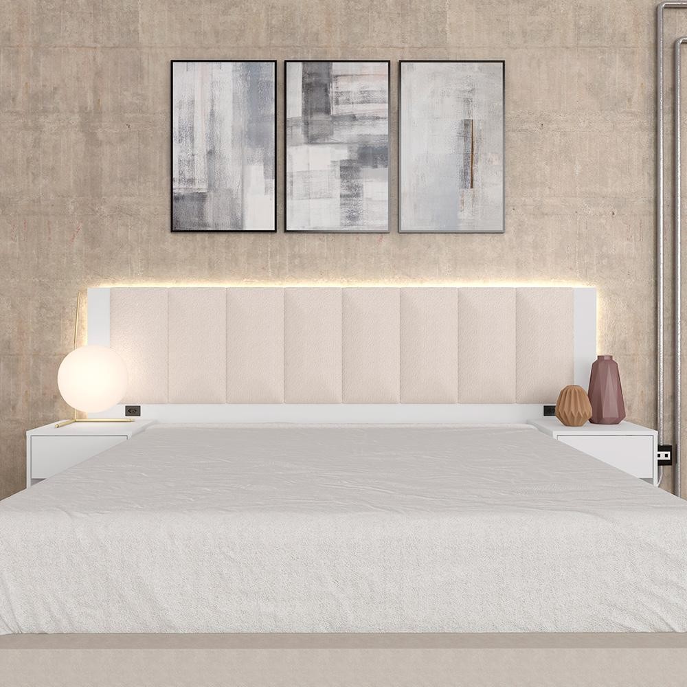 A Cabeceira Deinze, traz diferencial com seu sistema de iluminação LED embutido, que oferece uma iluminação suave e indireta, criando uma atmosfera acolhedora e relaxante Detalhes Técnicos: Medidas da Cabeceira montada: A: 121,5cm | L: 240cm | P: 45cm Materiais de Fabricação: - Chapa MDP 15mm - Revestimento: Pintura UV -Tonalidade: Branco -Tonalidade do tecido: Bouclé off white - Corrediça Metálica - Acompanha :Led e tomadas de energia (tomada para produtos de baixa potência) - Sapatas plásticas - Medida para cama:158cm - Estruturado com material de altíssima qualidade, evitando fungos e mofo. Conteúdo da Embalagem: - 01 Cabeceira - Plástico protetor - Caixa papelão - Acessório para Montagem: Cavilhas, Parafusos, Sache de cola, Etiqueta, Tapa furo. Observações Importantes: - Imagens ambientadas meramente ilustrativas, objetos decorativos não compõe o produto; - Produto novo, garantia somente para defeitos de fabricação: 3 meses; - Não realizamos entregas em zonas rurais, via caminhos fluviais e distritos, NÃO ACEITAMOS CEP GERAL; - Não trabalhamos com entrega agendada. O recebedor deve ter mais de 18 anos. O valor do frete não inclui: subida de escada, elevador ou lançamento de produto, em condomínio residencial a entrega é feita somente até a portaria. As entregas são realizadas em dias e horários comerciais; - Ao receber o produto observe se a embalagem está em perfeita condição. Confira atentamente a quantidade de volumes; - Produto entregue desmontado. É responsabilidade do cliente a montagem/instalação do produto, inclusive despesa para sua realização. Recomendamos a contratação de um profissional especializado; - Evitar a exposição direta à luz solar e à umidade. Limpar com pano macio e seco, não utilizar produtos químicos; - A cor do produto pode variar de acordo com o monitor, a iluminação do ambiente ou sua percepção visual.