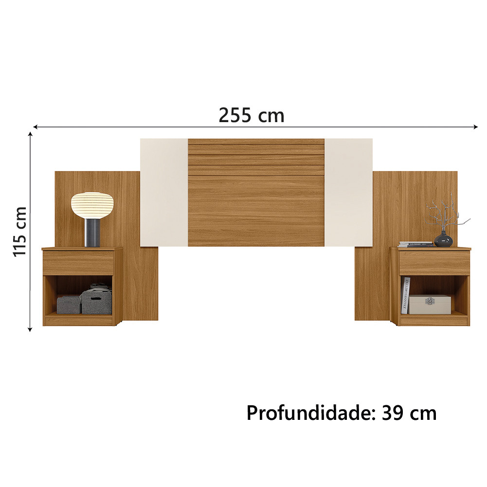 Quer agregar conforto e qualidade em seu quarto, sem perder a beleza? A Cabeceira Para Cama Box Casal Queen 1,40m/1,60m Araguaia tem a medida de 2,35m até 2,55m. Conta com uma mesa de cabeceira com nicho e gaveta de cada lado para acomodar seus livros, objetos pessoais e decoração. O produto é flex, com detalhes disponíveis nas cores Freijó, Off White e Cinza, e você pode escolher a desejada no momento da montagem! Seu acabamento em pintura UV oferece maior resistência e durabilidade ao produto. MEDIDAS: [ A ] = 115 cm [ L ] = 255 cm [ P ] = 39 cm MEDIDAS MESA DE CABECEIRA: [ A ] = 55 cm [ L ] = 37 cm [ P ] = 39 cm PESO DO PRODUTO: 45,78 kg PESO SUPORTADO PELO PRODUTO: 36 kg GAVETAS SUPORTAM ATÉ: 6 kg NICHOS SUPORTAM ATÉ: 6 kg Características MODELO: Cabeceira Para Cama Box Casal Queen 1,40m/1,60m Com Mesa De Cabeceira Flex Araguaia MARCA: Moval COR: Freijó/Off White/Cinza ACABAMENTO: Fosco ESTRUTURA: MDP ESPESSURA DO MATERIAL DA ESTRUTURA: 15 mm GAVETAS: 2 NICHO: 2 CORREDIÇAS: Aço ADAPTÁVEL PARA BOX DE: 1,38m e 1,58m GARANTIA: 3 Meses DIFERENCIAL: Cabeceira regulável com 2 mesas de cabeceira embutidas, acabamento fosco, acabamento em pintura UV que dá mais durabilidade ao produto. ITENS INCLUSOS: 1 Cabeceira com 2 mesas de cabeceira embutidas, 1 Manual de montagem, 1 Kit Parafusos. INSTRUÇÕES E CUIDADOS: Para maior durabilidade, é recomendável que a limpeza dos móveis seja feita com pano limpo e levemente umedecido em água e sabão neutro. Em seguida, deverá ser passado um pano limpo e seco. A Esplanada Móveis se responsabiliza pela entrega dos produtos adquiridos até a porta de entrada ou portaria do endereço indicado, se a portaria do condomínio permitir, as entregas são efetuadas no piso térreo e é de responsabilidade do cliente a locomoção da mercadoria até seu apartamento ou casa. Confira as dimensões do produto e certifique-se de que estão adequadas aos elevadores, portas e corredores do local da entrega. Não fazemos a montagem, desmontagem do produto e/ou portas e janelas, transporte pela escada ou içamento pelo lado de fora do prédio. Não está incluso no serviço de entrega o deslocamento até o interior do apartamento, com ou sem elevador, ou deslocamento em locais de difícil acesso como escadarias. Caso o cliente necessite de entrega dentro das dificuldades mencionadas, deverá entrar em contato para análise e cotação do valor do serviço. Certifique-se de tudo antes de finalizar a compra, evitando assim futuros desagrados ou imprevistos com a entrega.
