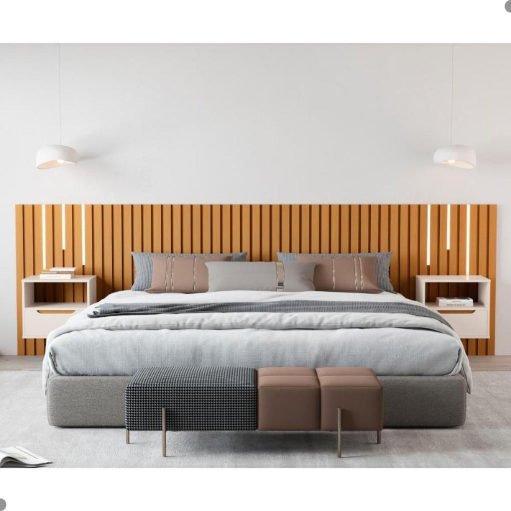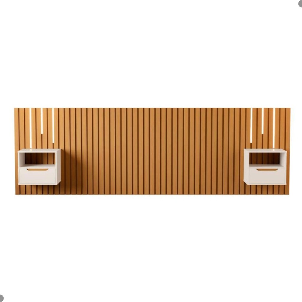 Essa Cabeceira possui a estrutura ripadas em 24mm garantindo a elegância e conforto que você precisa! Feita em MDP/MDF 24mm. Acompanha duas mesas de cabeceiras suspensas que possui gavetas com corrediças telecópicas e 1 Kit de LED. Comporta cama de 186x198 cm. Dimensão da Cabeceira: Altura: 331 cm Largura: 105 cm Profundidade: 37 cm Informações da Cabeceira: Cor: Nature Pérola Material: MDF e MDP Gavetas: Sim (2) Corrediça telescópicas Puxadores: Sim (2) Usinado Nichos: Sim (2) Extensível: Não Tamanho da Cama: King Led: Sim 2 mesas de cabeceira suspensa Itens inclusos: 01 Cabeceira. 1 Kid Led Kit completo para montagem e manual de instruções Garantia: 3 meses. Informações Complementares: - Fotos meramente ilustrativas do produto no ambiente. - Os objetos que ambientam as fotos não acompanham o produto; - Verificar descrição e tamanho do produto antes da compra. - Avaliar a mercadoria no ato do recebimento e recuse em caso de divergência ou avarias. - Mantenha as informações de contato e endereço de entrega atualizados para entrarmos em contato caso necessário. - Limpar com flanela ou pano macio seco, não utilizar produtos abrasivos, desengordurantes, álcool ou solvente. Não expor o produto diretamente à luz solar e à umidade. * Sugerimos a contratação de um montador profissional para a montagem do produto. Não nos responsabilizamos por avarias causadas no ato da montagem. * Não nos responsabilizamos pela montagem e desmontagem do produto no ato da entrega e devolução, assim como os custos gerados nestas situações. * A transportadora entregará o produto no andar térreo do endereço de entrega. * Não nos responsabilizamos por subir escadas, corredores e elevadores ou transporte por guincho em apartamento
