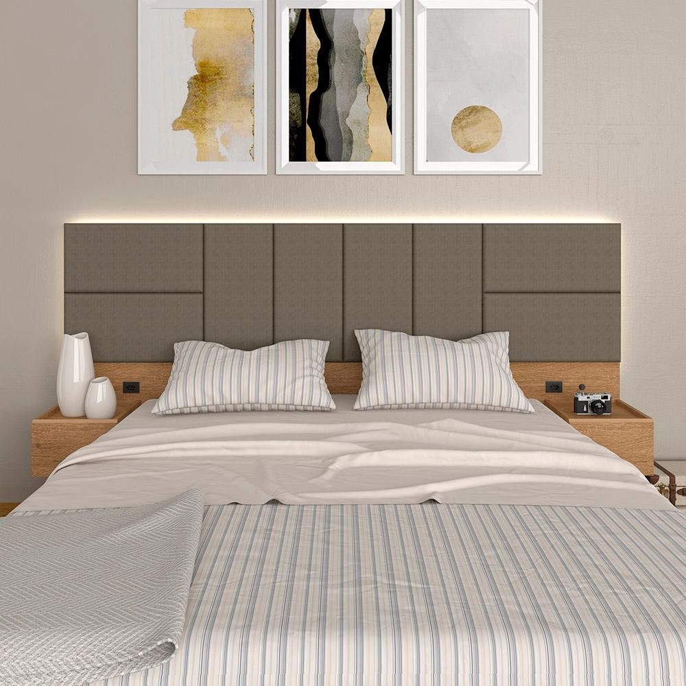 A Cabeceira Malibu com Led e mesas laterais une praticidade e conforto. O grande destaque é o painel almofadado trazendo modernidade e beleza. Detalhes Técnicos: Medidas da Cabeceira montada: A:90cm | L:220cm | P:36,5cm Materiais de Fabricação: - Chapa MDP 15mm - Revestimento: Pintura UV -Tonalidade: Carvalho Americano -Tonalidade do tecido : Suede Capuccino - Corrediça Metálica -Acompanha: Led e Tomadas de energia (tomadas para produtos de baixa potência) - Produto suspenso (Fixado na parede com régua) -Medida para cama:158cm - Estruturado com material de altíssima qualidade, evitando fungos e mofo. Conteúdo da Embalagem: - 01 Cabeceira - Plástico protetor - Caixa papelão - Acessório para Montagem: Cavilhas, Parafusos, Sache de cola, Etiqueta, Tapa furo. Observações Importantes: - Imagens ambientadas meramente ilustrativas, objetos decorativos não compõe o produto; - Produto novo, garantia somente para defeitos de fabricação: 3 meses; - Não realizamos entregas em zonas rurais, via caminhos fluviais e distritos, NÃO ACEITAMOS CEP GERAL; - Não trabalhamos com entrega agendada. O recebedor deve ter mais de 18 anos. O valor do frete não inclui: subida de escada, elevador ou lançamento de produto, em condomínio residencial a entrega é feita somente até a portaria. As entregas são realizadas em dias e horários comerciais; - Ao receber o produto observe se a embalagem está em perfeita condição. Confira atentamente a quantidade de volumes; - Produto entregue desmontado. É responsabilidade do cliente a montagem/instalação do produto, inclusive despesa para sua realização. Recomendamos a contratação de um profissional especializado; - Evitar a exposição direta à luz solar e à umidade. Limpar com pano macio e seco, não utilizar produtos químicos; - A cor do produto pode variar de acordo com o monitor, a iluminação do ambiente ou sua percepção visual.