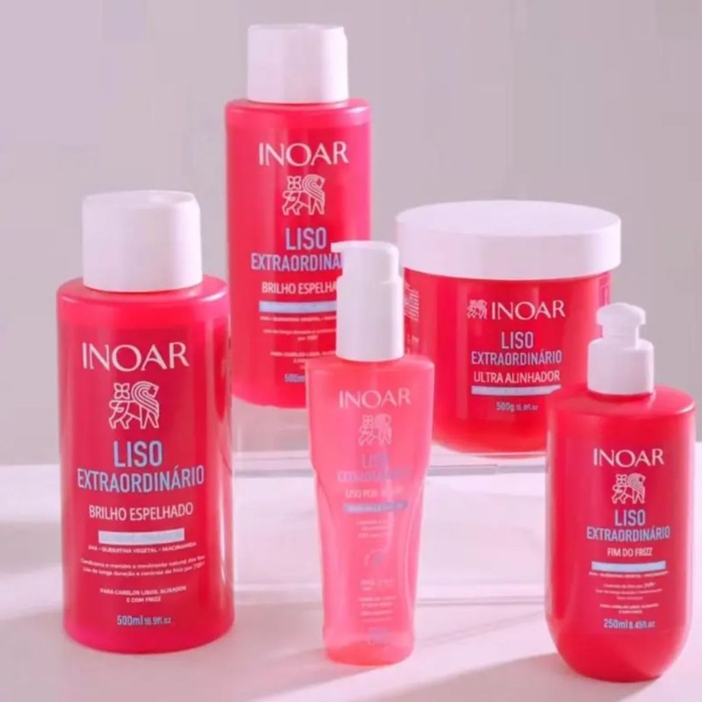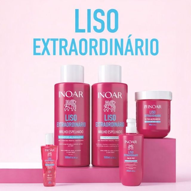 Cabelo Alinhado e Sem Frizz – Monte Seu Kit Liso Extraordinário Inoar O futuro dos cabelos lisos chegou com INOAR LISO EXTRAORDINÁRIO. A sua linha de produtos capilares, que elimina o frizz e prolonga a duração do efeito liso, sem esforço! A linha INOAR LISO EXTRAORDINÁRIO foi desenvolvida com tecnologia avançada para proporcionar fios lisos, alinhados e protegidos contra a umidade por até 10 dias. Com os ativos AHA, Queratina Vegetal e Niacinamida, os produtos atuam na reparação da fibra capilar, selagem das cutículas e combate ao frizz desde a primeira aplicação. Ideal para cabelos lisos, alisados ou com frizz. Essa é a rotina completa para um liso de alta performance, sem esforço. Shampoo ue uma pequena quantidade do Shampoo Liso Extraordinário INOAR nos cabelos úmidos. Massageie com as pontas dos dedos por toda a extensão dos fios e couro cabeludo. Enxágue. Se necessário, repita a operação. Condicionador Após lavar os cabelos com o Shampoo Liso Extraordinário INOAR, aplique o condicionador no comprimento e pontas. Massageie mecha a mecha. Enxágue completamente. Máscara Aplique a máscara nos cabelos limpos e úmidos, massageando por todo o comprimento. Deixe agir por 2 minutos e enxágue bem. Para melhores resultados, finalize com os demais produtos da linha Liso Extraordinário. Creme para Pentear Aplique nos cabelos limpos e úmidos, do comprimento às pontas. Penteie como de costume. Produto sem enxágue. Para melhores resultados, use a linha completa Liso Extraordinário. Sérum Leave-in Aplique somente nos cabelos úmidos, do comprimento às pontas, cobrindo todos os fios. Na primeira aplicação, após secar com o secador, utilize a chapinha para ativar a fórmula. Nos dias seguintes, sempre que lavar os cabelos, reaplique o produto e ative apenas com o secador - não utilize a chapinha novamente por 10 dias. Agite antes de usar.
