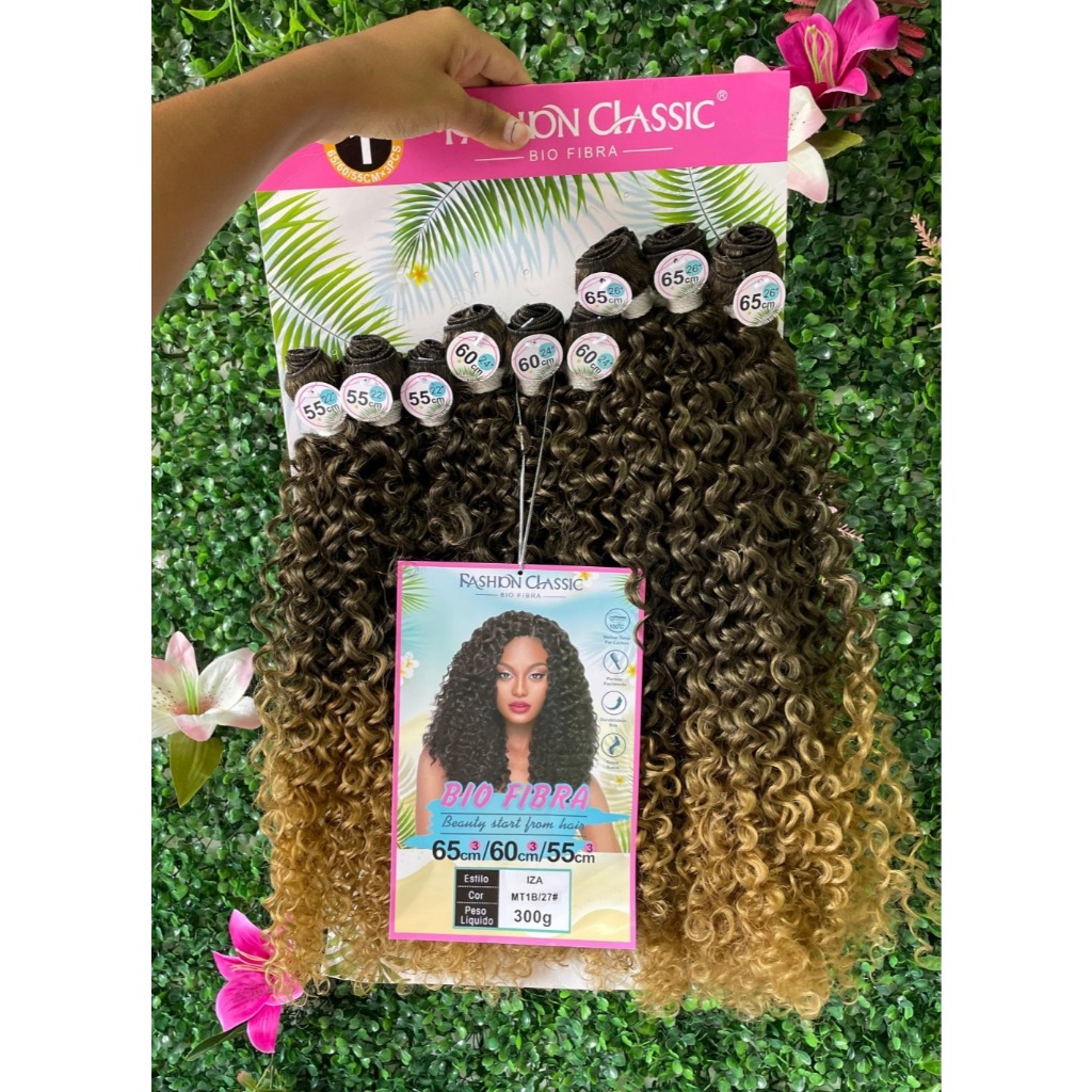 Cabelo cacheado bio fibra. Comprimento: Contém 9 telas. Sendo 55cm 3 telas, 60cm 3 telas e 65cm 3 telas. Peso total: 300 gramas. Marca: Fashion Classic. Modelo: Iza. - Lavar com shampoo SEM SAL e condicionador. - Pentear com cuidado. - Resistente ao calor, mas antes faça um teste em uma pequena mecha para determinar a temperatura ideal. - Fibra macia, semelhante ao cabelo humano.