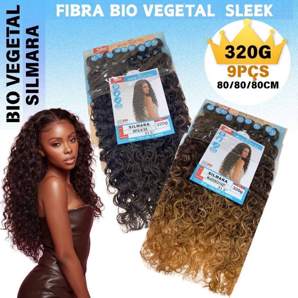 Cabelo Cacheado Bio Vegetal Cacheado Silmara Sleek - 80 cm 320gr Marca: Sleek Modelo: Bio Vegetal - Silmara Tipo de cabelo: Cacheado/Ondulado Comprimento: 55cm com cacho fechado e 65cm esticado (A forma universal para medição de cabelos cacheados e ondulados é com os fios esticados) Método de aplicação: Tela Telas: 9 Telas Material: Cabelo Bio Vegetal Peso Bruto: 320g A linha BIO VEGETAL de cabelos da marca Sleek é produzida com uma mistura de FIBRA ORGÂNICA e HUMANA da mais alta tecnologia, são todos importados e possuem aparência, balanço, brilho e textura muito próximos ao cabelo humano. Recomendamos seu uso para todas as pessoas que desejam fazer uma mudança rápida no visual com baixo custo e qualidade muito superior. Quantidade média recomendada para aplicação: 1 pacotes - Quantidade média utilizada para fazer o alongamento com pouco volume. 2 pacotes - Quantidade média utilizada para quem prefere um cabelo mais volumoso. Durabilidade Não existe um prazo de durabilidade estimado para os cabelos orgânicos. A durabilidade da fibra depende somente de seus cuidados diários com ela. OBSERVAÇÃO IMPORTANTE: As fibras são resistentes ao calor, portanto você pode utilizar modelador de cachos (baby liss), chapinha ou prancha que aqueça até 180º Celsius (360º Fahrenheit). Porém, saiba que o alisamento ou cachear de qualquer fibra sintética é irreversível e reduz a vida útil de seu cabelo orgânico.