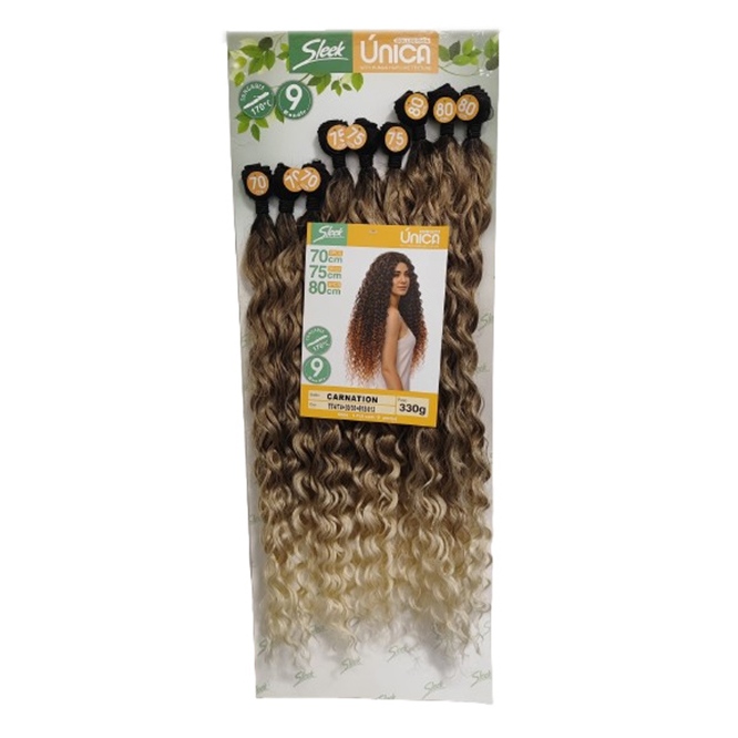 Cabelo Cacheado Bio Vegetal Cacheado Carnation Único Sleek - 70/75/80cm 330gr Marca: Sleek Modelo: Bio Vegetal - Carnation ÚnicoTipo de cabelo: Cacheado/Ondulado Comprimento: 70cm com cacho fechado e 80cm esticado (A forma universal para medição de cabelos cacheados e ondulados é com os fios esticados) Método de aplicação: Tela Telas: 9 Telas Material: Cabelo Bio Vegetal Peso Bruto: 330g A linha BIO VEGETAL de cabelos da marca Sleek é produzida com uma mistura de FIBRA ORGÂNICA e HUMANA da mais alta tecnologia, são todos importados e possuem aparência, balanço, brilho e textura muito próximos ao cabelo humano. Recomendamos seu uso para todas as pessoas que desejam fazer uma mudança rápida no visual com baixo custo e qualidade muito superior. Quantidade média recomendada para aplicação: 1 pacotes - Quantidade média utilizada para fazer o alongamento com pouco volume. 2 pacotes - Quantidade média utilizada para quem prefere um cabelo mais volumoso. Durabilidade Não existe um prazo de durabilidade estimado para os cabelos orgânicos. A durabilidade da fibra depende somente de seus cuidados diários com ela. OBSERVAÇÃO IMPORTANTE: As fibras são resistentes ao calor, portanto você pode utilizar modelador de cachos (baby liss), chapinha ou prancha que aqueça até 180º Celsius (360º Fahrenheit). Porém, saiba que o alisamento ou cachear de qualquer fibra sintética é irreversível e reduz a vida útil de seu cabelo orgânico. Qualquer duvida, estamos à disposição.
