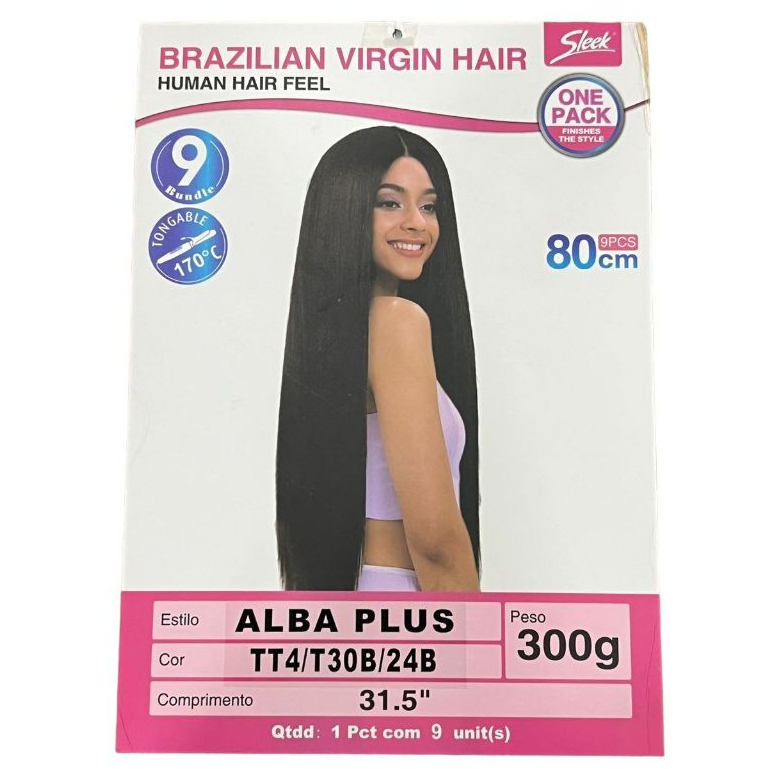 Cabelo Bio Vegetal - Sleek - Alba Plus 300g Tipo de fibra: Cabelo Bio Vegetal; Marca: Sleek BLISS Hair; Rendimento: 1 pacote faz a cabeça e 2 pacotes dão maior volume; Comprimento máximo: 80 centímetros; Peso: 300 gramas Itens inclusos em um pacote: 9 telas (80 cm) Aguenta temperaturas de até 170 °C, permitindo o uso de chapinha ou babyliss CARACTERÍSTICAS Marca: Sleek Brazilian Virgin Hair Tamanho: 80 cm Quantidade: 9 telas Tipo de Cabelo: Liso Método de Colocação: Entrelace CUIDADOS COM O CABELO Lave o cabelo com água fria ou morna, esfregando shampoo somente na raiz e condicionador somente no comprimento do cabelo, evitando nós e o ressecamento do cabelo; Tire os nós com os dedos ou pente de dentes largos. Se preferir, passe um pouco de creme para pentear (nada em excesso para não pesar o cabelo); Para dormir é recomendado utilizar uma touca de meia calça ou de cetim. Nada de lavar antes de dormir, pois não é saudável dormir com a raiz úmida; Evite mergulhar na água do mar ou piscina. PERGUNTAS FREQUENTES O que é cabelo orgânico? O cabelo orgânico é uma fibra de alta tecnologia. Foi elaborada com o objetivo de simular a textura e brilho do cabelo humano. Quanto tempo dura o cabelo orgânico? O tempo de duração depende dos cuidados com o cabelo, durando em média 3 a 6 meses quando cuidado direitinho. O cabelo embola? Seguindo os cuidados necessários ele permanece lindo por bastante tempo! Como cuidar do cabelo orgânico? - Você deve lavar o cabelo com água fria ou morna esfregando shampoo somente na raiz e condicionador somente no comprimento do cabelo, evitando nós e o ressecamento do cabelo; - Tire os nós com os dedos ou pente largo. Se preferir passe um pouco de creme para pentear; - Para dormir é recomendado utilizar uma touquinha daquelas que parecem meia calça. Nada de lavar antes de dormir, pois não é saudável dormir com a raiz úmida; - Evite mergulhar na água do mar ou piscina. Posso usar secador, chapinha ou babyliss? A maior parte dos cabelos permite, mas é importante verificar na embalagem do produto ou nos perguntar! A temperatura deve estar abaixo de 180ºC e você pode testar sempre em uma pequena mecha de cabelo. Posso cortar o meu cabelo sintético ou orgânico? Pode! Mas cuidado as pontas tendem a ficar ásperas se não cortado corretamente Cabelos orgânicos e/ou sintéticos aceitam química? Principalmente tintura? Não. Eles não absorvem nenhum tipo de química.