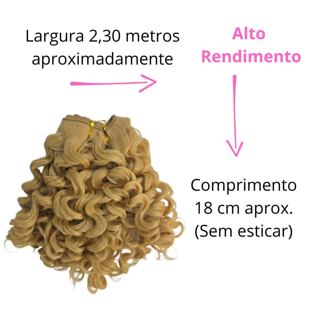 Cabelo em tira, acabamento com costura Alto rendimento Largura 2,30 metros aproximadamente Comprimento dos cachos ( sem esticar) 18 cm aproximadamente Cabelo em fibra orgânica ( A melhor qualidade do mercado ) Pode passar chapinha e secador ( testar a temperatura em uma mecha ) * Uma unidade é possível fazer 1 cabeça completa de uma boneca considerada grande de 50 cm * A aplicação pode ser feita com cola ou costurado Temos outras variedades de cabelos, artigos de armarinhos, material para confecção de bonecas de pano, cursos, olhos, tecidos, dentre outros Dica: Adicione mais de um produto ao carrinho para aproveitar o mesmo frete. Qualquer dúvida teremos o prazer em responder.