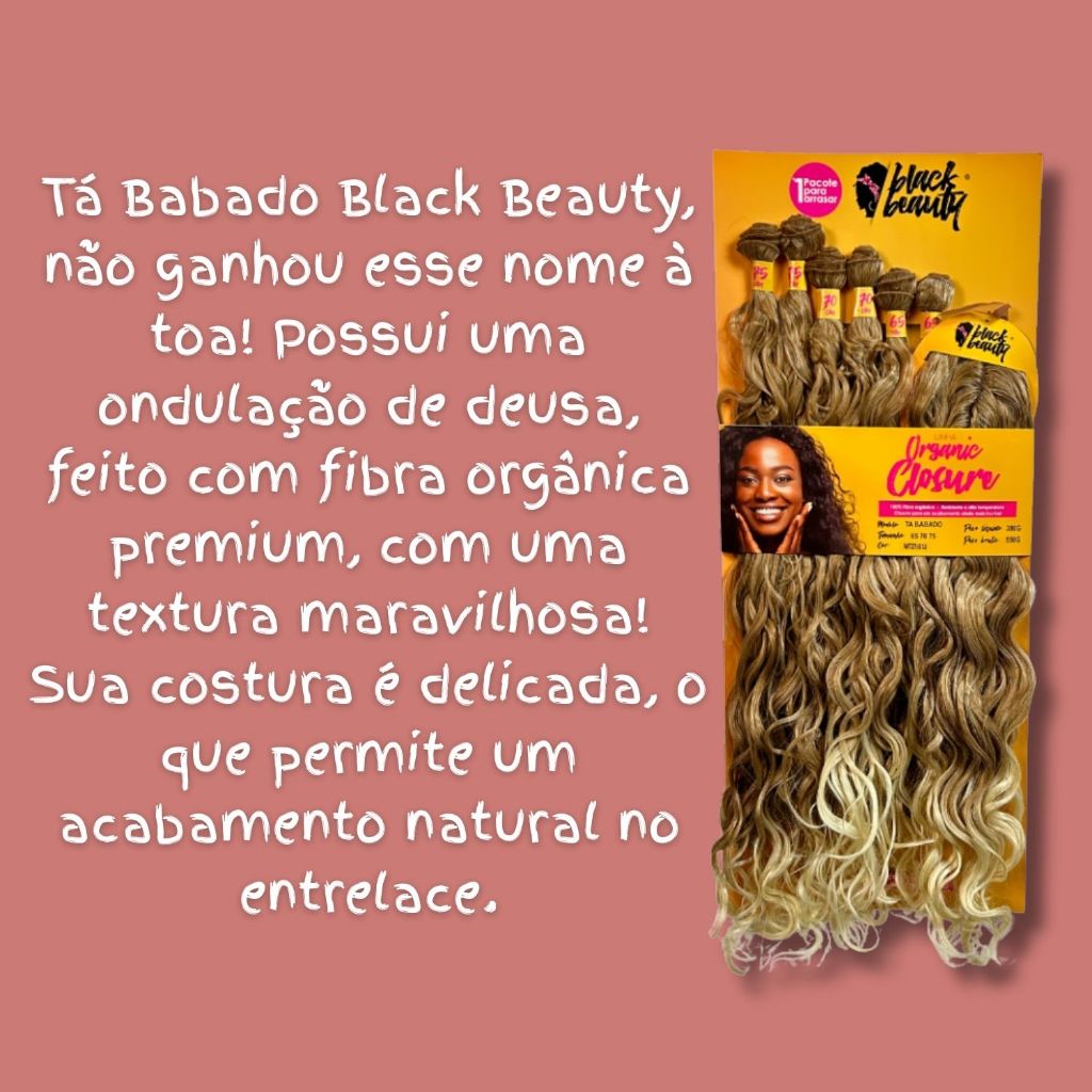Descrição: Recomendamos seu uso para todas as pessoas que desejam fazer uma mudança no visual com baixo custo e ótima qualidade. A versão Closure, TÁ Babado, não ganhou esse nome à toa! Possui uma ondulação de deusa, feito com fibra orgânica premium, com uma textura maravilhosa! Sua costura é delicada, o que permite um acabamento natural no entrelace. Desenvolvido com fibra orgânica premium de alta qualidade e resistente a altas temperaturas. As fibras possuem aparência, brilho e textura muito próximos ao cabelo humano. Perfeito para mudar a aparência, adaptando-se rapidamente a qualquer situação. A embalagem contém 380 gramas - 8 mechas de 3 tamanhos Comprimento: 65cm - 75cm Cabelo Fibra orgânica Premium Resistente a alta temperatura Quantidade indicada para o preenchimento na cabeça: 1 a 2 pacotes, dependendo do volume desejado. A durabilidade do cabelo varia de acordo com o cuidado de cada pessoa. Modo de usar: Procure sempre um profissional para aplicação e remoção da fibra. Lave e condicione regularmente. Para lavar: desembarace suavemente com os dedos antes de lavar; adicione uma pequena quantidade de shampoo em um recipiente com água fria; mergulhe a fibra e faça movimentos delicados até total limpeza, sem esfregar ou torcer; repita se necessário; enxague muito bem em água fria corrente, fazendo movimentos suaves; retire o excesso de água e envolva a fibra em uma toalha seca, sem esfregar ou torcer; não utilize escovas enquanto os fios ainda estiverem molhados; lembre-se de condicionar sempre os fios de seu aplique para que fiquem sempre macios; deixe secar naturalmente; depois de secos, se precisar escovar, dê preferência para as escovas tipo raquete, passando delicadamente pelos fios e com cuidado para não passar direto nas telas; nunca deixe resíduos de shampoo ou cremes nas telas e nas fibras. Precauções: Para ter fios sempre bonitos é imprescindível cuidar diariamente do seu cabelo sintético. Assim como o cabelo natural, o sintético exige cuidados para se manter com aspecto de novo e brilhante. Dentre os cuidados de manutenção estão: desembaraçar suavemente com os dedos ou utilizar pente/escova com dentes bem largos, lavar e condicionar regularmente com produtos adequados, usar produtos reparadores e aparar. Lavar com shampoo (sem sal ou PH neutro) somente o couro cabeludo, em seguida passar condicionador somente na extensão dos fios. Usar preferencialmente água fria. Não usar o secador, deixar secar naturalmente (as fibras não são resistentes ao calor do secador). Não estilizar usando temperatura (secador, chapinha, babyliss, etc.). Como ocorre com todos os apliques de fibras sintéticas, a umidade e o roçar dos fios podem fazer com que o cabelo se emaranhe. Para manter a textura suave, use produtos amaciantes/condicionantes para cabelos. Para dormir, o mais adequado é usar uma touca de cetim. Faça um coque frouxo e coloque a touca. Para desembaraçar, passe somente os dedos ou utilize suavemente o pente ou escova com dentes bem largos, começando pela parte de baixo. É aconselhável usar creme de pentear ou reparador de pontas. A durabilidade do cabelo varia de acordo com o cuidado de cada pessoa. Composição: Fibra de polipropileno