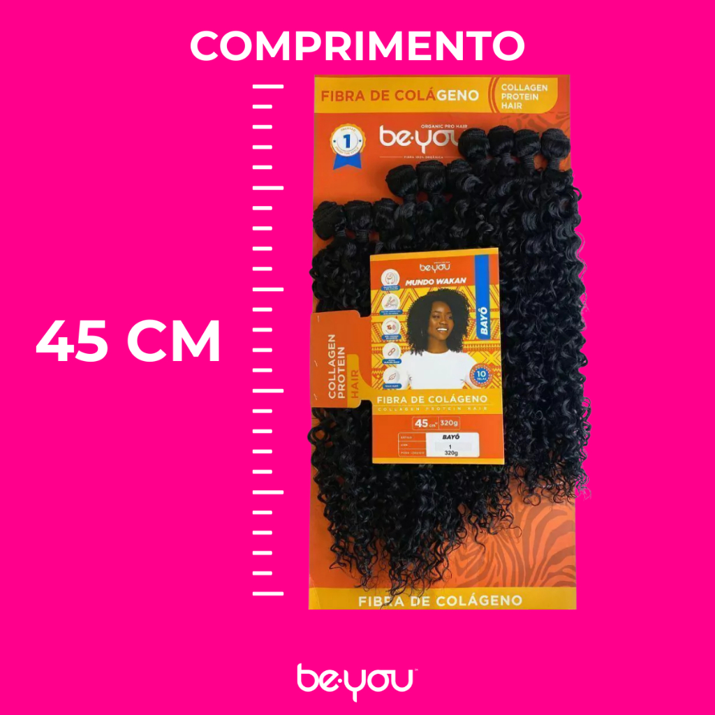 Cabelo de Fibra de Colágeno Bayô – Be You Hair (Curto Cacheado 4A) O Cabelo Bayô da Be You Hair é confeccionado em fibra de colágeno 100%, ideal para quem busca praticidade, volume e beleza natural no dia a dia. Com curvatura 4A curta, apresenta cachos definidos, encorpados e com excelente balanço, valorizando o rosto e garantindo um visual moderno, natural e cheio de personalidade. Possui toque macio, movimento natural e ótima durabilidade, sendo perfeito para alongamentos, perucas e penteados práticos. Detalhes do pacote: Peso total: 320 g distribuídos em 10 telas Todas as telas com 45 cm Curvatura: 4A – cachos fechados, definidos e volumosos Cuidados com a Fibra Como Lavar: Dilua shampoo sem sal em um borrifador com água. Aplique apenas no couro cabeludo, sem esfregar a fibra. Deixe a espuma escorrer e amasse levemente as mechas. Enxágue com água morna (evite água quente para não alterar a curvatura). Aplique condicionador mecha a mecha. Secagem: Seque naturalmente ou com secador em jato frio ou quente, até 150 °C. Certifique-se de que o couro cabeludo esteja completamente seco. Finalização: Use pequenas quantidades de creme, reparador de pontas ou gelatina. Para manutenção, retire eventuais teias com uma tesourinha. Aplicação: Entrelaçamento Faça tranças rasteiras (embutidas) no couro cabeludo. Costure as telas com linha e agulha apropriadas, da nuca ao topo. Utilize jumbo para reforçar a base ou criar penteados adicionais. Dicas Extras: Durma com touca ou fronha de cetim para evitar frizz. Prenda com elástico revestido em cetim. Indicado para mega hair, perucas (wigs), tic tac e rabos de cavalo.