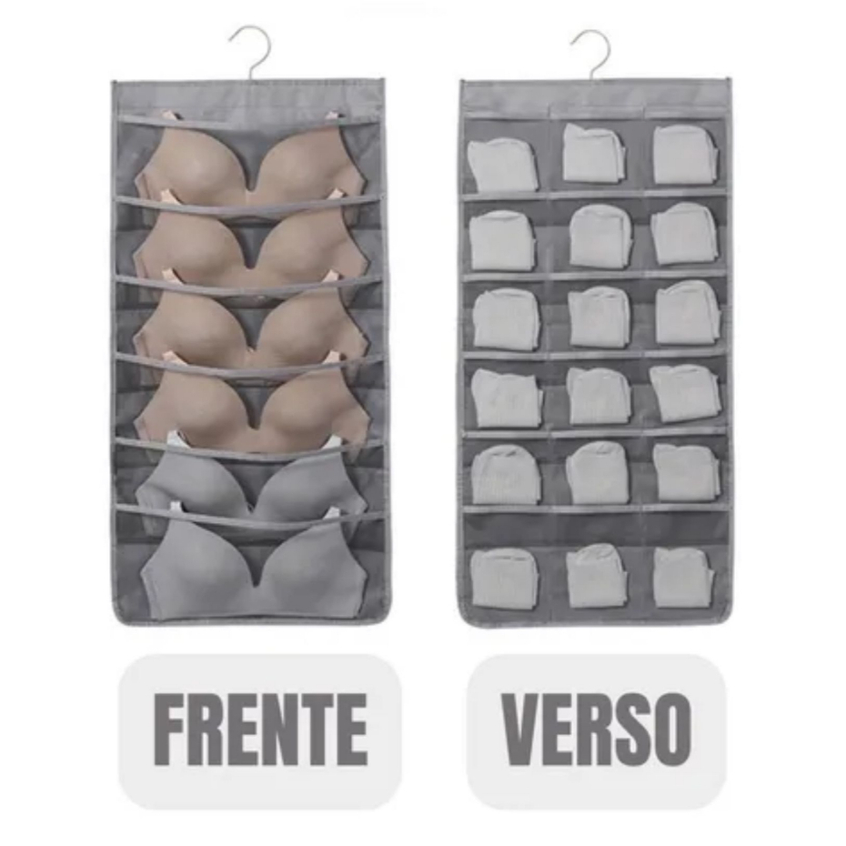 **ENVIAMOS CORES ALEATORIAMENTE CONFORME A DISPONIBILIDADE DO ESTOQUE** ORGANIZADOR SUSPENSO COM 24 BOLSOS - CABIDE DUPLA FACE Ideal para guardar suas roupas íntimas e encontrá-las facilmente quando precisar. Organizadores produzidos em material totalmente ecológico, antibolor e que permite a passagem de ar tornando o produto resistente à umidade. Produto superfácil de lavar, totalmente dobrável sendo fácil de guardar quando não utilizado, perfeito para viagens. Acompanha gancho, basta pendurar e começar a organizar-se, bolsos telados que permitem fácil visualização, lado A 8 bolsos grandes perfeito para guardar sutiã e lado B 16 bolsos ideais para guardar peças menores como calcinha, cueca, meias e acessórios. ESPECIFICAÇÕES TÉCNICAS: - Largura (cm): 40 - Altura (cm): 78 - Profundidade dos bolsos (cm): 14 - Material: TNT - Gancho (aço Cromado) -Lado A 6 Bolsos Lado B 16 Bolsos