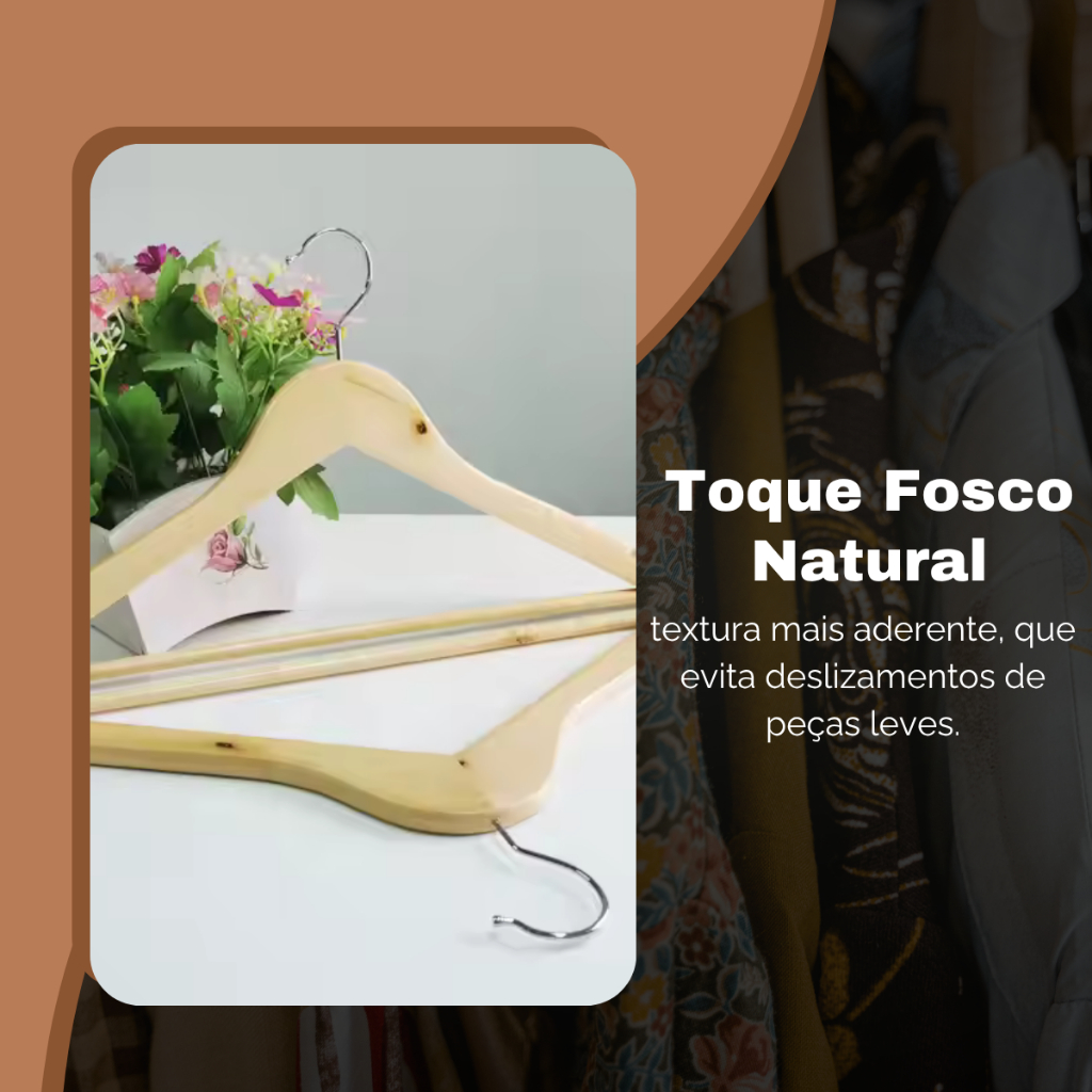 Cabide de Madeira Natural SEM VERNIZ Destaques do produto: Produzido em madeira maciça sem verniz, com acabamento rústico e natural Ideal para lojas, closets abertos e ambientes que prezam pela estética minimalista e orgânica Design clássico com curvatura suave que respeita a forma das roupas Gancho metálico resistente e giratório, facilitando o uso em diversos tipos de cabideiros Superfície levemente porosa que evita o deslizamento das peças Sustentável: sem uso de produtos químicos, mantendo a madeira em seu estado puro FAQ – Perguntas Frequentes Esse cabide mancha roupas claras? Não. Por não conter verniz, ele não possui químicos que possam transferir coloração para os tecidos. No entanto, recomenda-se uso em ambientes secos. É indicado para roupas pesadas como casacos ou ternos? Sim! A estrutura em madeira maciça oferece ótima resistência, suportando bem peças mais pesadas. A madeira tem cheiro forte? Não. O cabide é natural, sem nenhum tipo de tratamento químico, e por isso não possui odor. Pode ser usado em araras de loja? Com certeza. Seu visual clean e rústico combina perfeitamente com ambientes comerciais que valorizam o estilo natural e minimalista. Qual o tamanho do cabide? O tamanho padrão é de aproximadamente 44 cm de comprimento, ideal para roupas adultas.