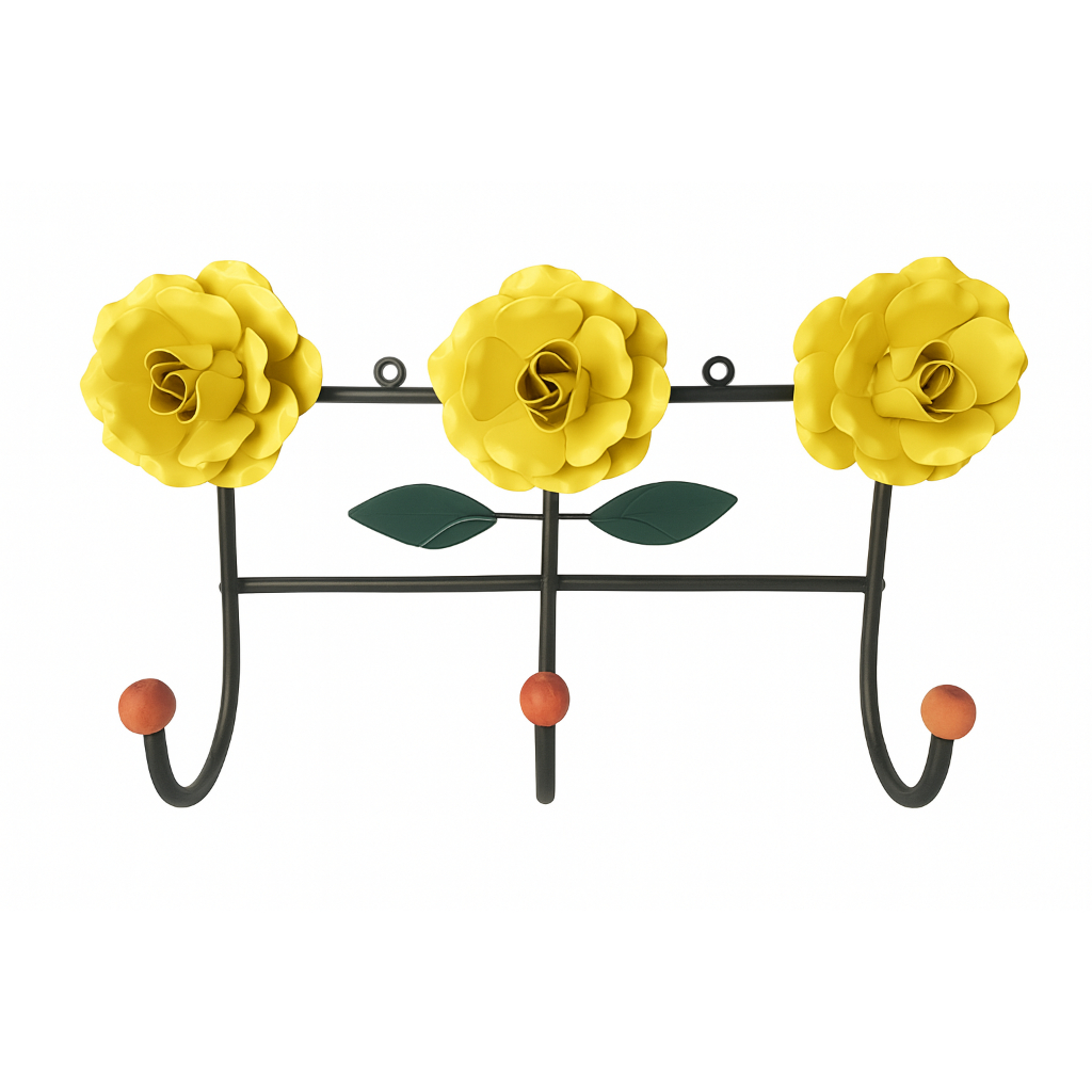 Cabideiro de Parede 3 Flores Amarelo - Cabide 3 Ganchos Artesanal | Metal | Decoração e Organização