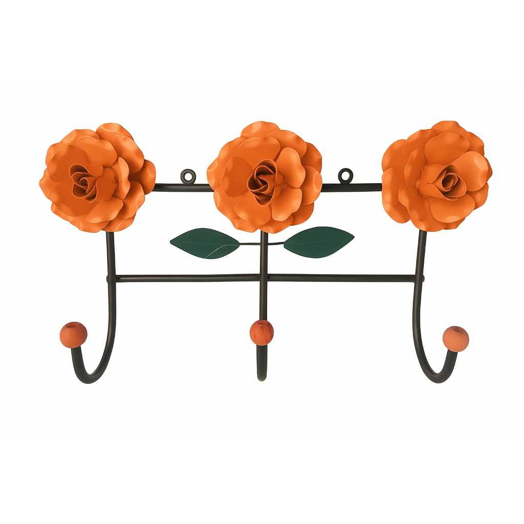 Cabideiro de Parede 3 Flores Laranja - Cabide 3 Ganchos Artesanal | Metal | Decoração e Organização