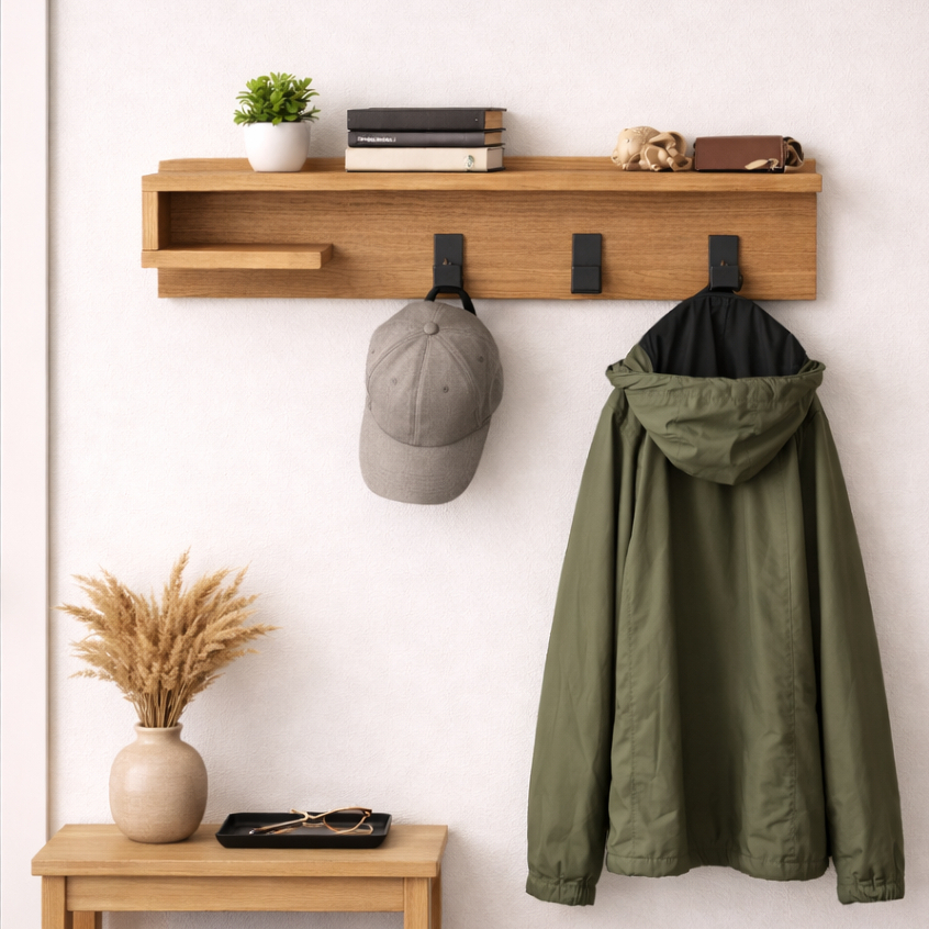 Transforme qualquer ambiente com um toque de organização e elegância. Nosso cabideiro com prateleira une design moderno e funcionalidade, sendo a escolha perfeita para quem busca praticidade sem abrir mão do estilo. 📐 Medidas: Altura: 14cm Largura 75cm Profundidade: 6cm 🔧 Instalação: Fácil de instalar: Acompanha parafusos e buchas 🪵Material MDP Freijó Fosco de Alta qualidade Gancho em Aço Carbono ideal 🚚Transporte Rápido envio para todo o Brasil