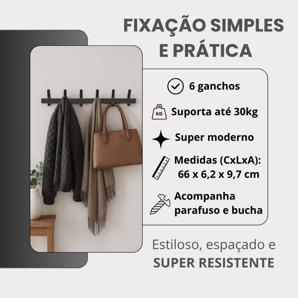 Organizador parede 6 ganchos da marca brasforma é a solução ideal para otimizar seu espaço e manter a organização do seu dia a dia. Com um design prático e funcional, ele permite pendurar bolsas, chaves, toalhas, chapéus e casacos, facilitando o acesso e evitando a desordem. Fabricado em aço carbono de alta qualidade, o suporte possui um peso máximo suportado de 30 kg, garantindo durabilidade e segurança para seus itens. Suas dimensões compactas o tornam perfeito para qualquer ambiente, seja na entrada de casa, no banheiro ou no quarto. A instalação é simples, e a versatilidade do organizador se adapta a diferentes estilos de decoração. Mantenha sua casa sempre arrumada e estilosa com este organizador suspenso que é, sem dúvida, uma adição prática e elegante ao seu espaço. Organização e Estilo para Seu Ambiente! Tenha mais praticidade e organização na sua casa com o Cabideiro de Parede com 6 Ganchos. Fabricado em aço carbono de alta resistência e acabamento em pintura eletrostática, ele é perfeito para quem busca durabilidade, elegância e funcionalidade em um só produto. Capacidade de Suporte de até 30kg – Ideal para casacos, mochilas, bolsas, chapéus, toalhas e muito mais. Design Moderno – Acabamento sofisticado que combina com diversos ambientes: sala, quarto, corredor, banheiro ou escritório. Fixação Segura na Parede – Garante estabilidade e firmeza após instalado. Durabilidade Garantida – O aço carbono com pintura eletrostática é resistente à corrosão, riscos e desgastes, mantendo a beleza do produto por muito mais tempo. Especificações Técnicas: Material: Aço Carbono Pintura: Eletrostática de alta qualidade Ganchos: 06 unidades Capacidade de peso: Até 30kg Instalação: Fixação direta na parede (parafusos inclusos) Dê mais praticidade ao seu dia a dia! Organize seu espaço com estilo e resistência. Entrega imediata!!