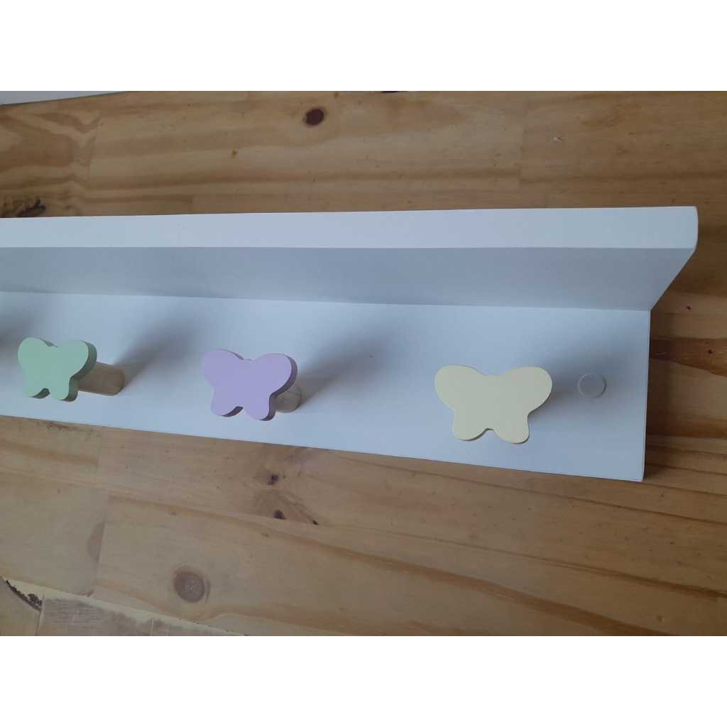 Organize e decore com Cabideiro e Pendurador Infantil com prateleira 5 pinos borboleta O cabideiro decora e ao mesmo tempo traz maior organização ao pendurar o que quiser e ainda decorar com uma prateleira em cima. O acabamento deste produto é especial e feito artesanalmente com todo carinho. Os 4 pinos formato borboleta são pintados na cores tons pastéis: rosa, lilás, amarelo, verde e laranja. Material: MDF 15mm acabamento fosco branco Dimensões: 60cm larg 10cm alt 10cm prof