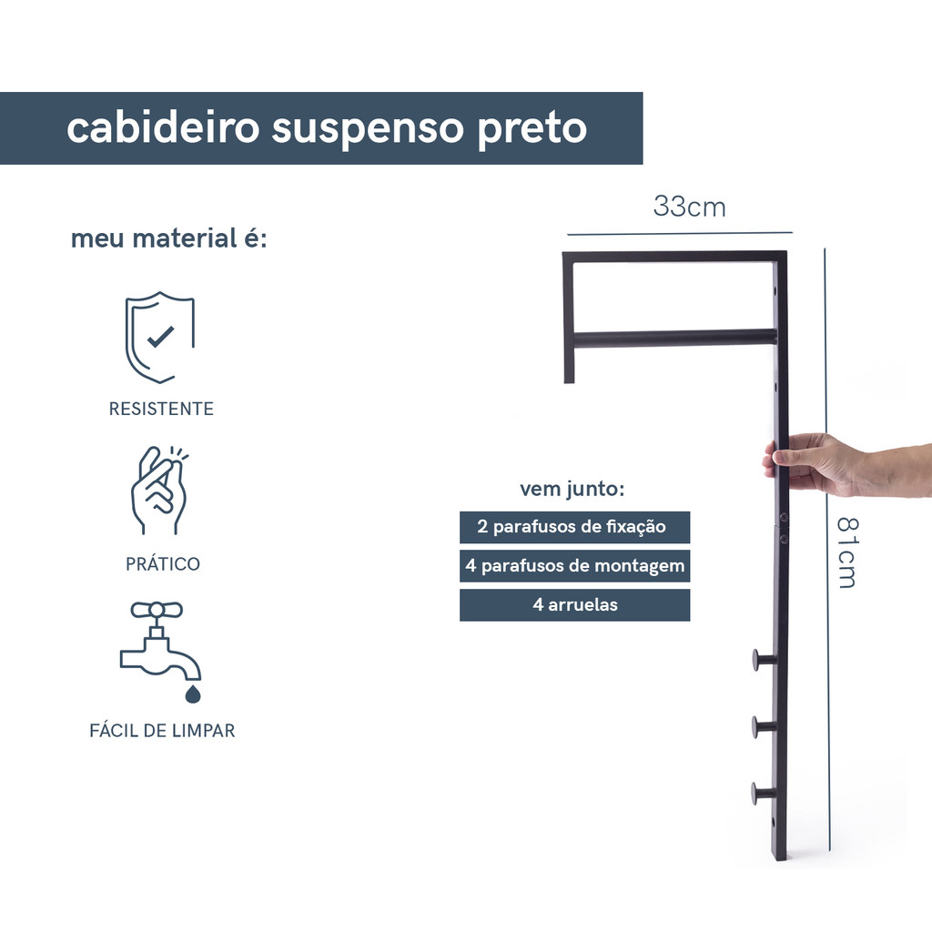 Esse é o cabideiro suspenso, da OIKOS. Resistente: feito de ferro bem resistente, esse cabideiro aguenta bolsas, mochilas, roupas, toalhas, chapéus, plantas e o que mais você quiser suspender. Bem legal para quem tem pressa: ele prende na parede para organizar entradas, quartos, banheiros, lavanderias e escritórios, deixando os itens básicos sempre à mão. Dupla função: além de resistente, o ferro fosco presto também tem uma pegada industrial e minimalista, que faz desse cabideiro um item funcional e decorativo ao mesmo tempo, uma belezura! Fácil de montar: basta encaixar a parte em L na parte inferior (que tem os 3 ganchos para bolsas) e fixá-lo na parede com as peças de montagem inclusas.