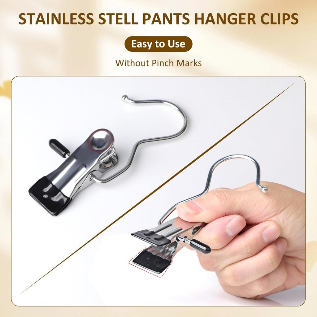 Cabides para calças inoxidáveis multifuncionais: Abra um novo modo de organização de roupas Você ainda está preocupado com a organização de roupas? E com as marcas feias que os grampos para cabides podem deixar nas roupas? Nossos grampos para cabides de calças inoxidáveis multifuncionais são o salvador da organização que você sempre procurou! I. Material resistente e durável O corpo principal desse grampo para cabide é feito de aço inoxidável de alta qualidade. O aço inoxidável não apenas tem uma ótima resistência à corrosão. Mesmo em ambientes úmidos do armário, ele pode manter sua aparência imaculada por muito tempo, sem ferrugem ou corrosão, diferentemente de outros materiais metálicos comuns. Além disso, é robusto e resistente, capaz de suportar o peso de roupas pesadas, sem preocupação com deformação ou danos. Com uma longa vida útil, uma compra é suficiente para benefícios duradouros. II. Projeto prático e cuidadoso A parte do grampo foi projetada com cuidado. A força de fixação é adequada. Ela pode segurar firmemente calças, saias e outras roupas, impedindo que elas escorreguem, mas sem deixar marcas difíceis de remover nas roupas por causa de uma força excessiva. Isso cuida de cada peça de roupa que você ama. A curva do gancho segue a ergonomia, facilitando a sua fixação no varal do armário e tornando fácil pegar e deixar as roupas. III. Uso multifuncional Embora chamado de grampo para cabide de calças, suas funções vão muito além disso. Ele pode ser usado para pendurar calças yoga, calções, calças jeans, saias, deixando a organização das roupas inferiores perfeita. Além disso, pode ser usado para pendurar chapéus, meias, sutiãs esportivas, lenços e outros itens pequenos, aproveitando ao máximo o espaço vertical do armário e transformando um armário desordenado em um lugar organizado. IV. Facilidade e praticidade no uso A simplicidade na operação é um destaque desse produto. Basta pressionar levemente para fixar as roupas e soltar para removê - las. Mesmo idosos e crianças podem usá - lo facilmente. Além disso, é compacto e leve, não ocupando muito espaço. Seja para usar no armário da casa ou para levar em viagens, é muito adequado. Escolher nossos grampos para cabides de calças inoxidáveis multifuncionais é escolher um estilo de vida organizado, ordenado e fácil. Não hesite mais, leve para casa agora e deixe a organização de roupas ser tão simples!