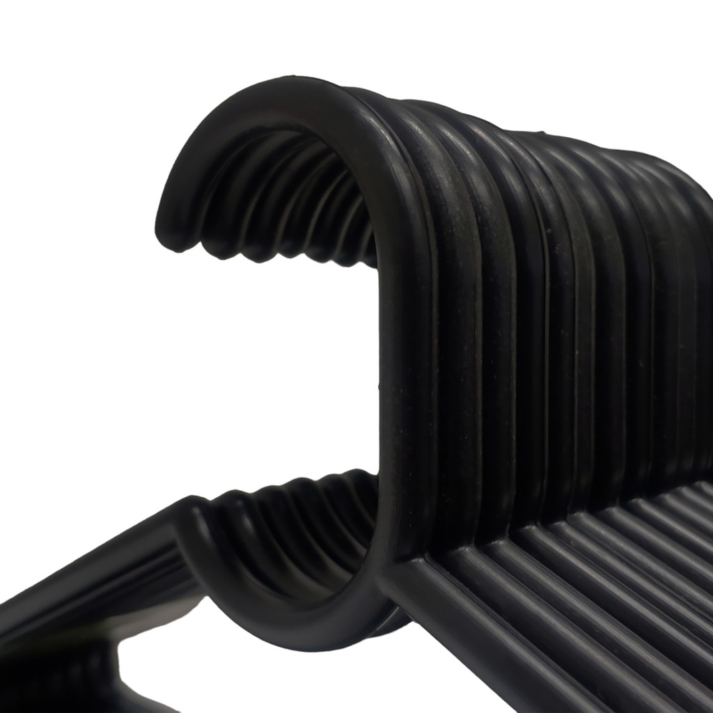 KIT COM 30 CABIDES REFORÇADOS ANTI-DESLIZANTES EM POLIPROPILENO COM FORMATO ARREDONDADO. Características: - Altura: 17 cm - Comprimento: 37 cm - Espessura: 07 mm (0,7 cm) - Cor: Preto Nossos cabides foram projetados após um longo período de pesquisas e análise com nossos clientes sendo um modelo mais resistente e com uma espessura maior diferenciando dos demais concorrentes e trazendo mais rigidez e robustez estrutural. Os cabides possuem formato arredondado e liso não deixando marcas na roupa e prolongando assim a vida útil das roupas. Modelo exclusivo próprio para atender desde o atacadista, lavanderias, Lojas de Roupas e até o usuário mais exigente. Seu tamanho é compatível com todos os guarda-roupas, possuindo um ótimo acabamento, trazendo a funcionalidade e a simplicidade ao tirar e colocar roupas, além de contar com alças para pendurar peças delicadas. O modelo foi projetado para todas suas peças de roupas e acessórios, ele evita que as peças deslizem e se danifique. Com material resistente e com reforço estrutural na parte inferior do cabide seu design com curvas delicadas e mantendo uma aparência simples, funcional, moderna e contemporânea.