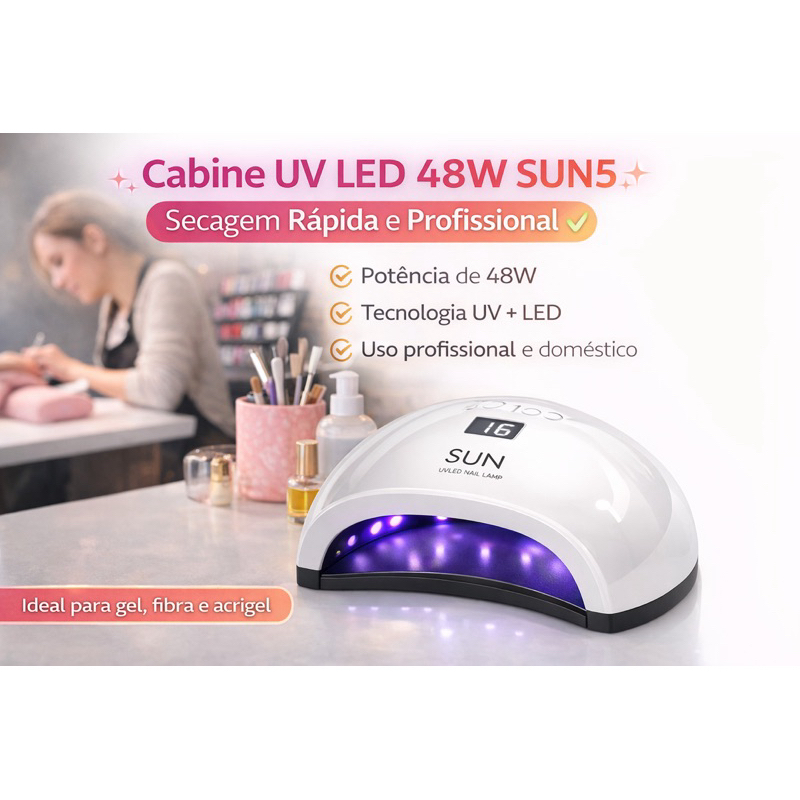 ✨ Cabine UV LED 48W SUN – Secagem Rápida e Profissional ✨ 💅 Tenha unhas impecáveis com acabamento de salão sem sair de casa! A Cabine UV LED 48W SUN é ideal para secagem rápida de esmaltes em gel, acrigel e fibra, garantindo resultado uniforme, durabilidade e praticidade no dia a dia. ⸻ 🔥 Destaques do Produto: ✔ Potência de 48W – secagem rápida e eficiente ✔ Tecnologia UV + LED – melhor desempenho e durabilidade ✔ Compatível com gel, acrigel, fibra e outros ✔ Display digital com temporizador ✔ Sensor automático (liga ao colocar a mão) ✔ Modelo bivolt (110V/220V) ✔ Design moderno, leve e portátil ⸻ ⏱ Mais agilidade no seu atendimento ou rotina! Perfeita tanto para profissionais quanto para uso pessoal. ⸻ 📦 Especificações: • Potência: 48W • Tecnologia: UV/LED • Voltagem: Bivolt automático • Timer digital • Dimensões aproximadas:
