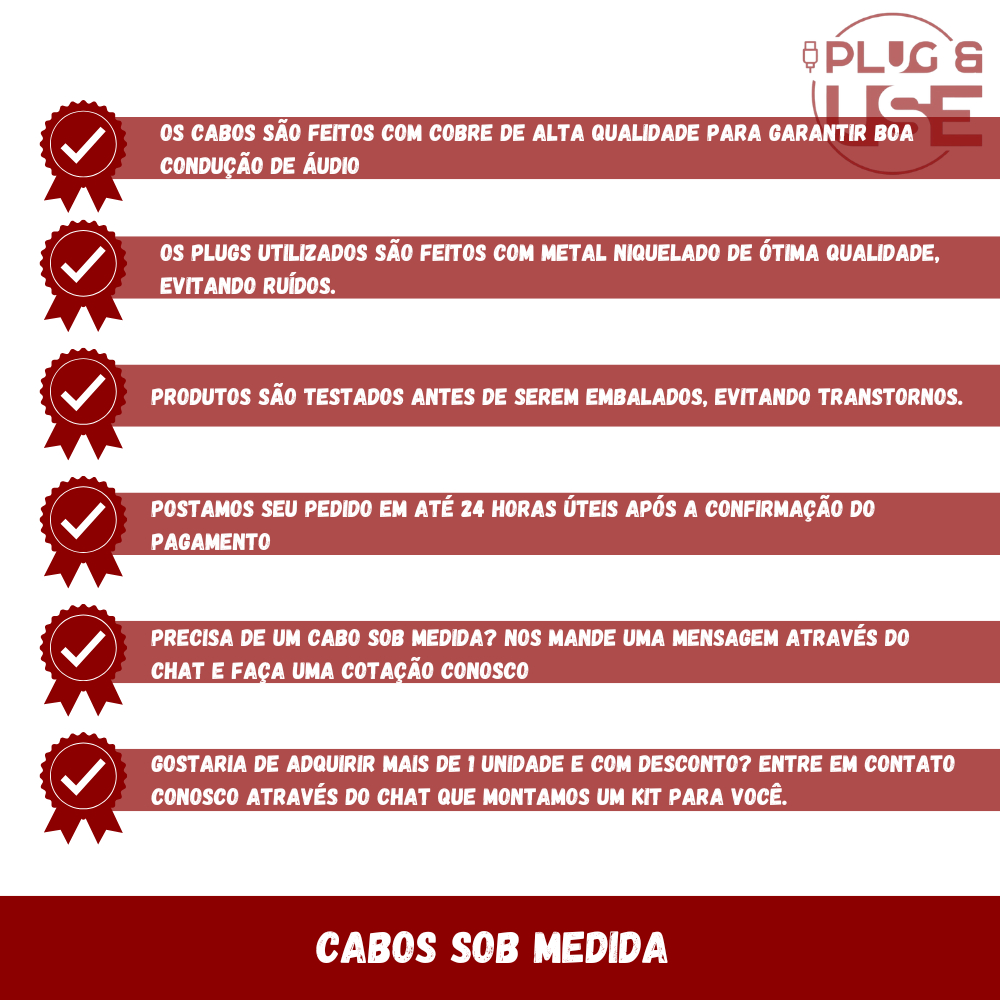 Cabo P2 Fêmea → XLR Macho (20 cm) Função Geral: Esse cabo permite conectar um fone de ouvido, celular, notebook, tablet ou qualquer outro dispositivo com saída de áudio P2 (3,5 mm TRS) em uma entrada XLR macho (geralmente em mesas de som, mixers ou gravadores profissionais). Especificações: Conectores: P2 Fêmea (3,5 mm TRS) ↔ XLR Macho (3 pinos) Comprimento: 20 cm Compatível com: Smartphones, computadores, microfones de lapela, interfaces de áudio e mixers Construção: Cabo flexível e resistente com blindagem contra interferência Uso: Transmissão de áudio estéreo (P2) para entrada XLR mono ⚠️ Observações: Ideal para reproduzir áudio de dispositivos com saída P2 em equipamentos com entrada XLR. Converte sinal estéreo (P2) para mono balanceado (XLR) – pode haver junção ou perda de um dos canais dependendo do equipamento. Não recomendado para microfones P2 com alimentação plug-in power, pois XLR pode não fornecer energia adequada. Este adaptador não transmite alimentação de microfone phantom power (48V). Não é adequado para conectar pinos P2 4 vias (3 listras).