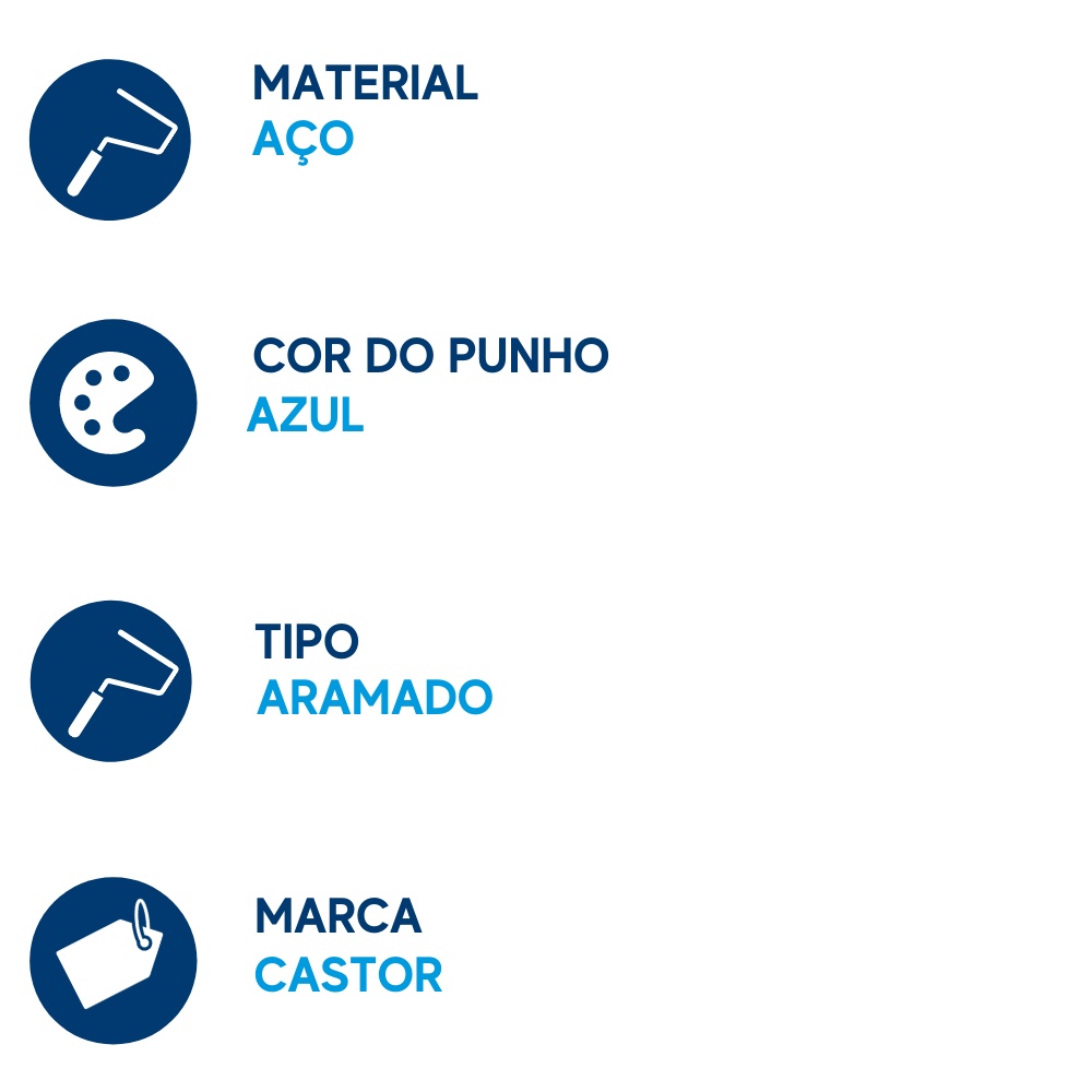 O cabo aramado 23 cm da Castor conta com 5 arames que garantem o ajuste perfeito dos rolos, e suporte de encaixe com bucha de pressão para rolos de 23cm. Sua tecnologia garante que o rolo se mantenha firme de ponta a ponta durante toda a pintura. O uso deste cabo é universal. CARACTERÍSTICAS Aspectos: Ajuste perfeito, robustez, além de uso universal. Ambiente: sala de estar e jantar, quarto, hall, escritório e garagem. Uso: Rolos de 23 cm. Código do fabricante: 041 Limpeza e Conservação: Após o uso, retirar o excesso do resíduo utilizado. Para tintas látex PVA ou acrílicas, lavar com água corrente e sabão. Para esmaltes sintéticos, óleos, vernizes ou zarcão, lavar com solvente mineral adequado, e depois com água e sabão. Secar e guardar em local arejado. FERRAMENTAS QUE COMPLEMENTAM Para você que precisa de produtos especiais para ajudar a pintura a render mais, além de otimizar o tempo do trabalho, a Castor tem a solução! A linha de Especiais para Pintura oferece tudo que você precisa para conseguir um resultado profissional em todos os seus trabalhos. SEGURANÇA Compre com segurança! Nossa equipe de suporte sempre estará à disposição caso tenha algum problema ou dúvida. Aguardamos seu pedido!