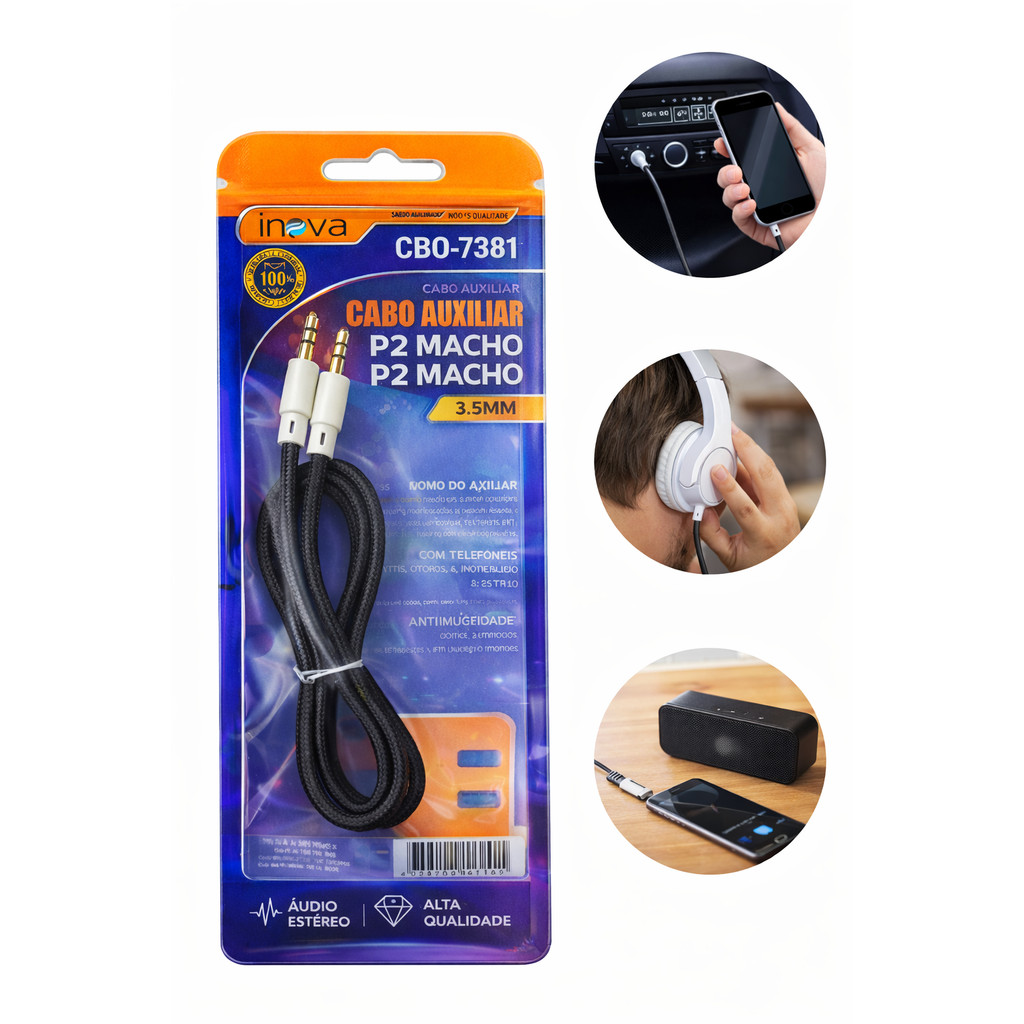 Cabo Auxiliar P2 Macho x P2 Macho Inova KV-406 – Áudio Estéreo de Alta Qualidade Se você quer ouvir suas músicas com qualidade e sem complicação, o Cabo Auxiliar P2 Macho x P2 Macho Inova KV-406 é a escolha ideal. Perfeito para conectar celular, notebook, tablet ou outros dispositivos em caixas de som, som automotivo ou fones de ouvido com entrada P2, garantindo som estéreo limpo e conexão estável para o seu dia a dia. DESTAQUES DO PRODUTO • Conexão P2 Macho x P2 Macho (3.5mm) • Som estéreo de alta qualidade • Conectores resistentes com encaixe firme e seguro • Cabo flexível e durável para uso diário • Ideal para carro, caixas de som, celulares, tablets e notebooks • Produto leve e fácil de transportar ITENS INCLUSOS 1 Cabo Auxiliar P2 Macho x P2 Macho Inova KV-406 ESPECIFICAÇÕES • Marca: Inova • Modelo: KV-406 • Tipo de conexão: P2 Macho x P2 Macho (3.5mm) • Tipo de áudio: Estéreo • Material: Cabo flexível e resistente • Compatibilidade: Dispositivos com entrada P2 (3.5mm) • Uso: Celulares, tablets, notebooks, caixas de som, som automotivo e fones de ouvido DÚVIDAS FREQUENTES Funciona em som de carro? Sim, funciona perfeitamente em veículos com entrada auxiliar P2. Posso usar em celular ou notebook? Sim, desde que o dispositivo tenha entrada P2 (3.5mm). O áudio tem boa qualidade? Sim. O cabo foi desenvolvido para oferecer transmissão de áudio limpa e sem interferências. Produto novo, original, com nota fiscal e envio imediato.