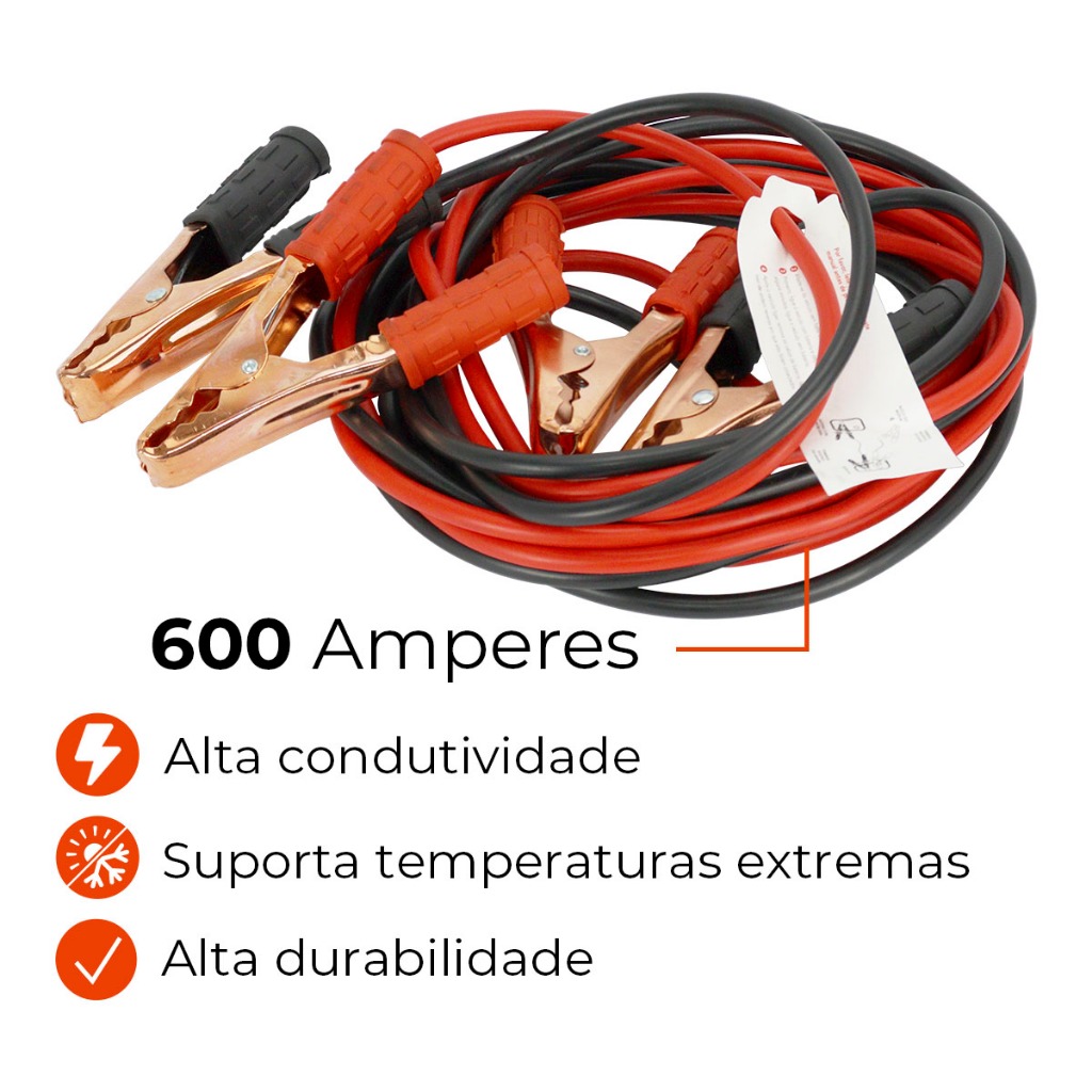 A Bravus é referência no mercado quando o assunto são peças e acessórios automotivos. Prezando pela qualidade e acabamentos, consequência da tecnologia de ponta investida para melhor atender e aproximar nossos clientes. Projetado para atender as demandas de amperagem de todos os veículos, este cabo garante uma transmissão de energia eficiente e segura, essencial para emergências na estrada. Com seu design robusto e materiais de alta qualidade, é a solução ideal para recarregar baterias de caminhões, carros, motos e mantê-los em operação. Ficha Técnica: • Corrente Máxima: 600a; • Comprimento: 5m; • Isolamento: PVC resistente a altas temperaturas e abrasão; • Conectores: Garras tipo jacaré de aço revestidas com cobre; • Bitola: 10mm²; • Revestimento cobreado; ** ACOMPANHA BOLSA PARA ARMAZENAMENTO ** Benefícios: ✅Alta Capacidade: Suporta até 600 Amperes, ideal para TODOS os veículos. ✅Durabilidade: Robusto para uso frequente e em condições adversas. ✅Segurança Garantida: Isolamento duplo que previne curtos-circuitos e superaquecimento. ✅Fácil Armazenamento: Acompanha bolsa prática para armazenamento e transporte. ✅Versatilidade: Pode ser utilizado TODOS os veículos como carros, caminhões, ônibus e motos. ○○○○○○○○○○○○○○○○○○○○○○○○○○○○○○○○○○○○○○○○○○○○○○○○ A Ninja Parts, fundada em 2016 em Curitiba-PR, é um e-commerce referência nacional em peças e acessórios automotivos. Oferecemos as melhores marcas com qualidade e envio rápido, priorizando a satisfação do cliente e um excelente atendimento. Garantia • 90 dias a partir da data da compra; • Garantia válida apenas para defeitos de fábrica. Não é coberto mau uso, má instalação, quebra ou adaptações que alterem características originais do produto; Trocas e Devoluções • Importante que todos os itens sejam enviados nas embalagens originais de forma segura; • Caso o produto retorne danificado, os custos ficarão sob responsabilidade do cliente; Recomendação • A instalação seve ser realizada por um profissional de sua confiança; Compra Garantida • Transação Segura; • Estorno automático em caso de imprevistos; • Acompanha nota fiscal; • Produtos a pronta entrega.