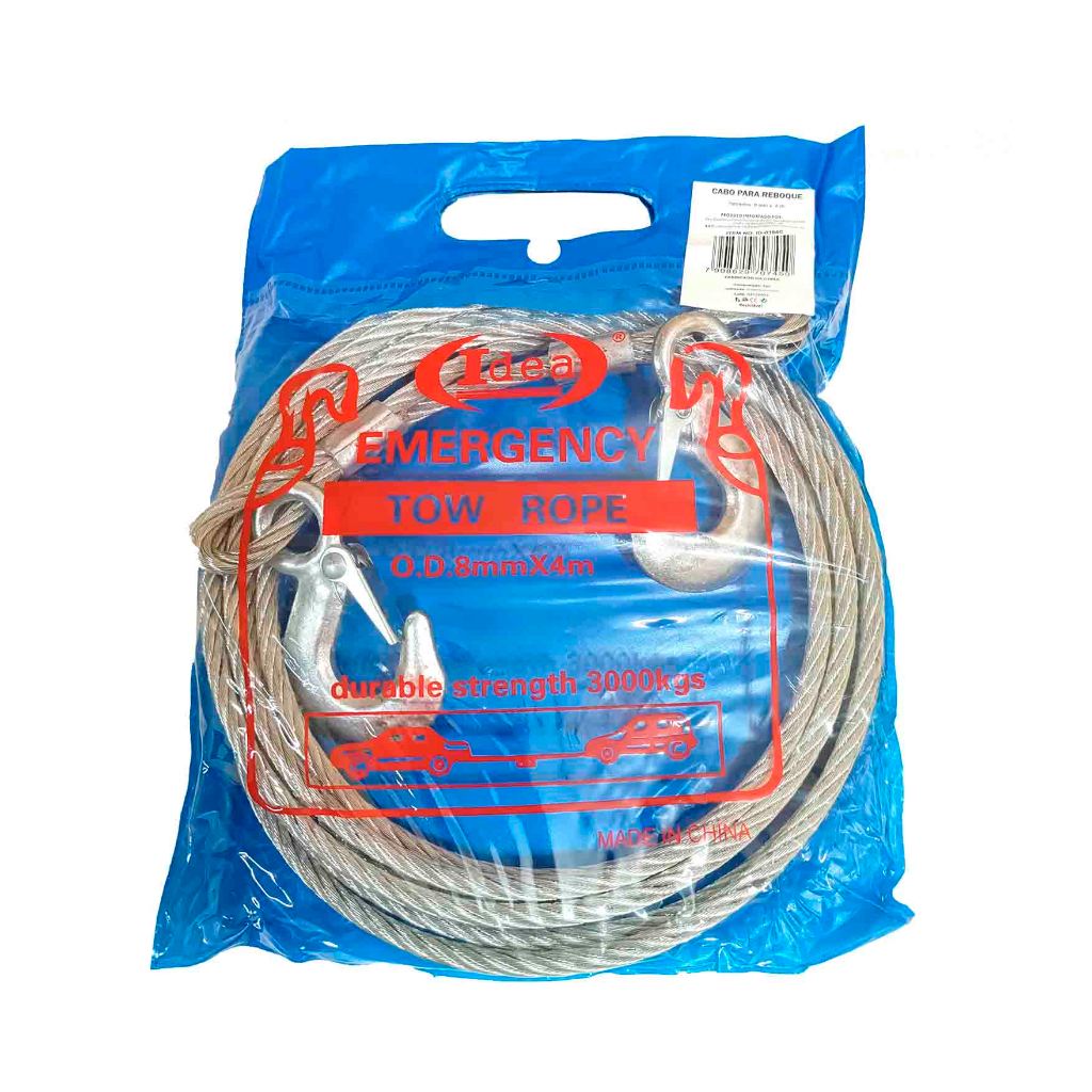 DESCRIÇÃO DO PRODUTO Cabo de Aço para Reboque com 2 ganchos, produto de altíssima qualidade, e durabilidade. Características: :Ganchos em aço forjado de alta resistência. :Cabo de 8mm x 4 Metros. Marca: IDEA. Ref: ID-0364C. Ideal para Reboque de Carros, Caminhonetes, e Caminhões. Garantia do vendedor: 3 meses