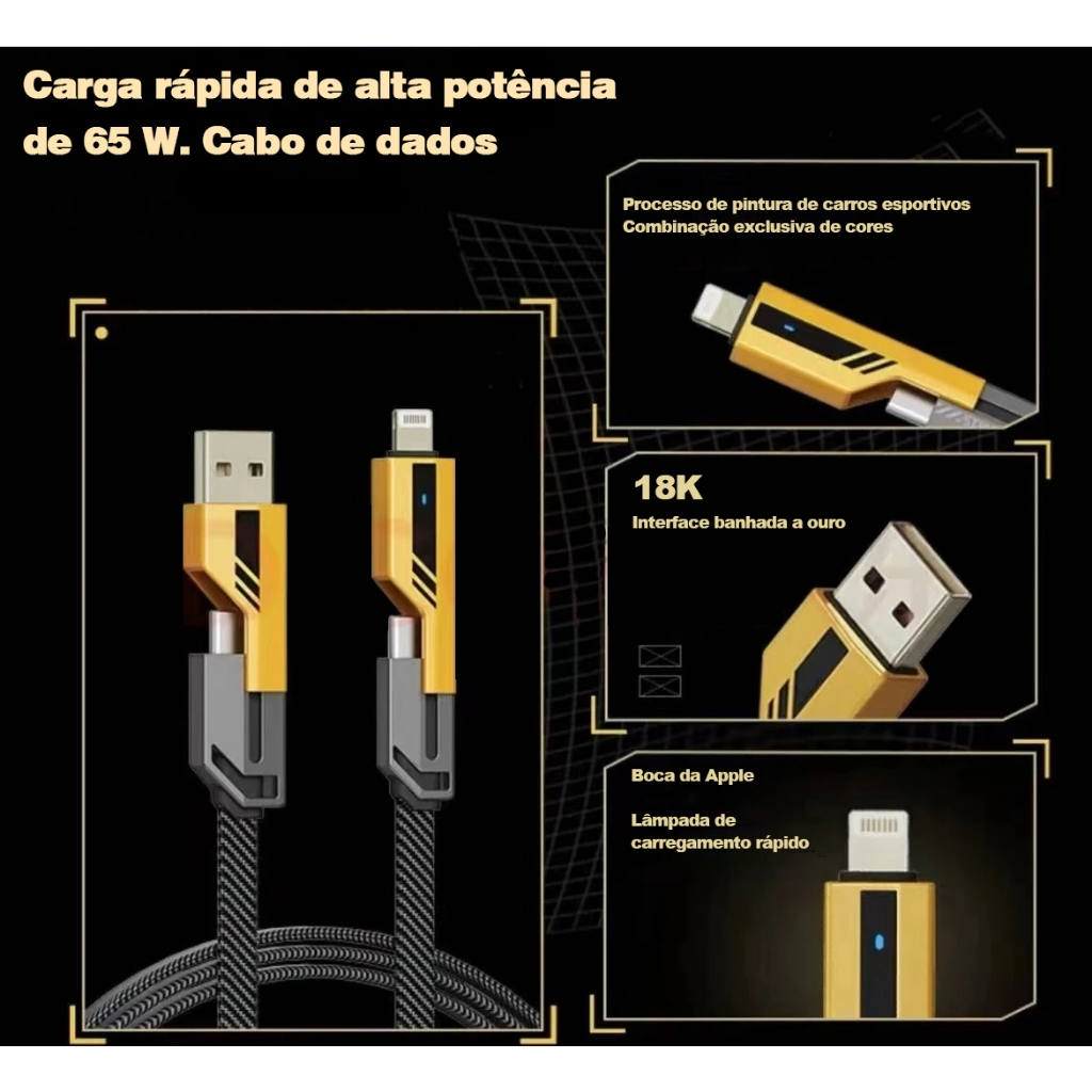 PD 65W + 27W Carregamento Rápido Quatro conectores · Quatro escolhas Atenda às suas múltiplas necessidades USB A + Tipo-C Conector Oculto 2-em-1 Design de conector oculto, portátil e não ocupa espaço, material de liga de zinco, oferece uma experiência de carregamento diferente 65W (máximo) High Power Output Com carregador do paládio, a potência de saída pode ser até 65W, aprecia a emoção do carregamento de alta velocidade Carregamento Rápido para DOIS DISPOSITIVOS AO MESMO TEMPO Suporte PD 65W + 27W Carregamento Rápido Um é suficiente para Telefone/Tablet/Laptog Adsorção Magnética Cabo mais grosso trançado nylon de alta densidade para maior durabilidade