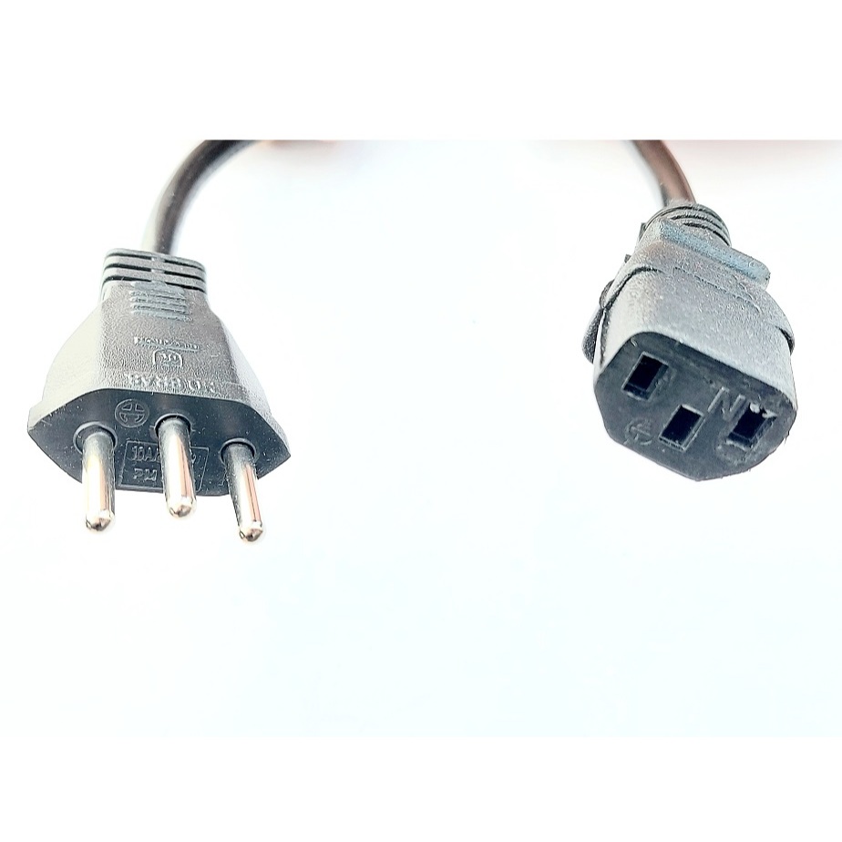 Padrão Brasileiro Nema - Plug Macho NBR 14136. Corrente Máxima + -10 amperes Tensão: até 250V. 3 Fios internos 0,75mm 300 / 500V NBR 247 -5 NM 70ºC. 1 Plugue fêmea tipo IEC C13. 1 Plugue macho pinos redondos 4,00mm. Comprimento de 1,50 metros. Composição: Termoplásticos, cobre, latão e níquel. Para CPU, Impressoras e outros Equipamentos.