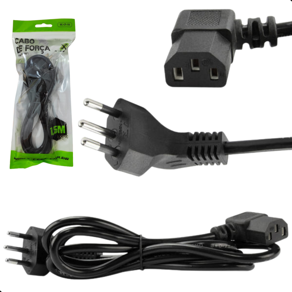 Cabo de Energia Tripolar 90° ( 1,5 metros ) NA COR PRETA - Cabo de Força Tripolar Padrão Brasileiro Novo de 3 pinos - Compatível com redes de 110 e 220 Volts - Certificado até 250 Volts x 10 Amperes - Marca: X-cell - Comprimento 1.5 metros - Diâmetro: 0,75mm - Cor: Preto **Certificado pelo INMETRO, garantindo assim seu uso com total segurança. Compatibilidade - Fontes de Alimentação (PCs Desktop) - Vários modelos de Monitores - Impressoras - Projetores - Alguns modelos de TVs - Panelas elétricas