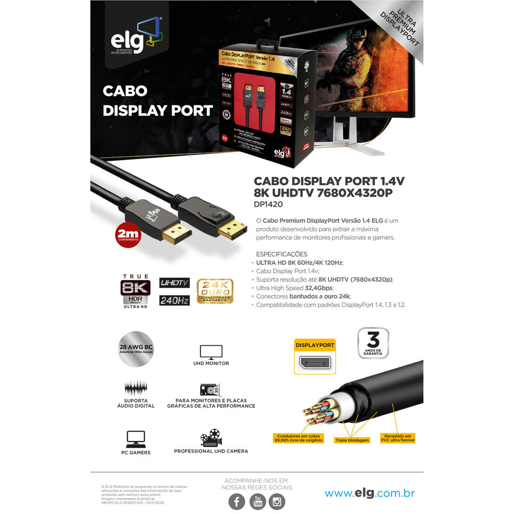 Desfrute de som e imagem incomparáveis com ELG. O máximo em resolução para o seu monitor! O cabo DisplayPort 1.4 premium DP1420 da ELG garante o mais alto nível de qualidade de imagem e som, sendo a solução ideal para os usuários mais exigentes. Com suporte para resolução 8K Ultra HD (7680x4320p), 4K a 144Hz e uma incrível largura de banda de 32.4 Gbps, ele é perfeito para jogos de última geração e monitores profissionais. A tecnologia Dynamic HDR oferece imagens mais realistas, enquanto o áudio imersivo é compatível com Dolby Atmos. Para os gamers, o Game Mode VRR (taxa de atualização variável) proporciona máxima fluidez e elimina quebras de quadros. O cabo de 2 metros possui tripla blindagem para evitar interferências. Na embalagem você recebe 1 Cabo DisplayPort 1.4, pronto para liberar todo o potencial do seu monitor gamer ou profissional. Características Técnicas Tipo: Cabo DisplayPort 1.4 Premium Comprimento: 2 metros Resolução: 8K UHD (7680x4320p @ 60Hz), 4K @ 144Hz, FHD @ 240Hz Largura de Banda: 32.4 Gbps Compatibilidade: DisplayPort 1.4, 1.3 e 1.2 Material: PVC e Conector Metálico Cor: Preto Recursos de Vídeo: Dynamic HDR, 3D Ready, Game Mode VRR Recursos de Áudio: Dolby Atmos, Dolby TrueHD 7.1 Extras: Tripla blindagem, Cobre livre de oxigênio. IMPORTANTE :: As imagens dos produtos são meramente ilustrativas e podem apresentar pequenas variações de cor ou acabamento, conforme iluminação, resolução do monitor ou percepção visual. :: Objetos de decoração e itens adicionais exibidos nas fotos não acompanham o produto. :: Todas as informações técnicas e características dos produtos são de responsabilidade da marca ELG, podendo sofrer alterações sem aviso prévio. :: Os pedidos são sempre enviados de forma completa. Caso haja produtos com prazos de postagem diferentes, será considerado o maior prazo para envio do pedido. :: Valores e condições podem ser alterados sem aviso prévio e são válidos exclusivamente para compras realizadas neste site. :: A garantia ELG é limitada ao produto e não cobre danos ocasionados por mau uso, instalação incorreta ou manuseio inadequado. SOBRE A ELG: A ELG é uma empresa brasileira que preza pela alta qualidade. Nossa política é aplicada em toda linha de produtos e garante que os consumidores possam adquirir itens que foram amplamente testados.