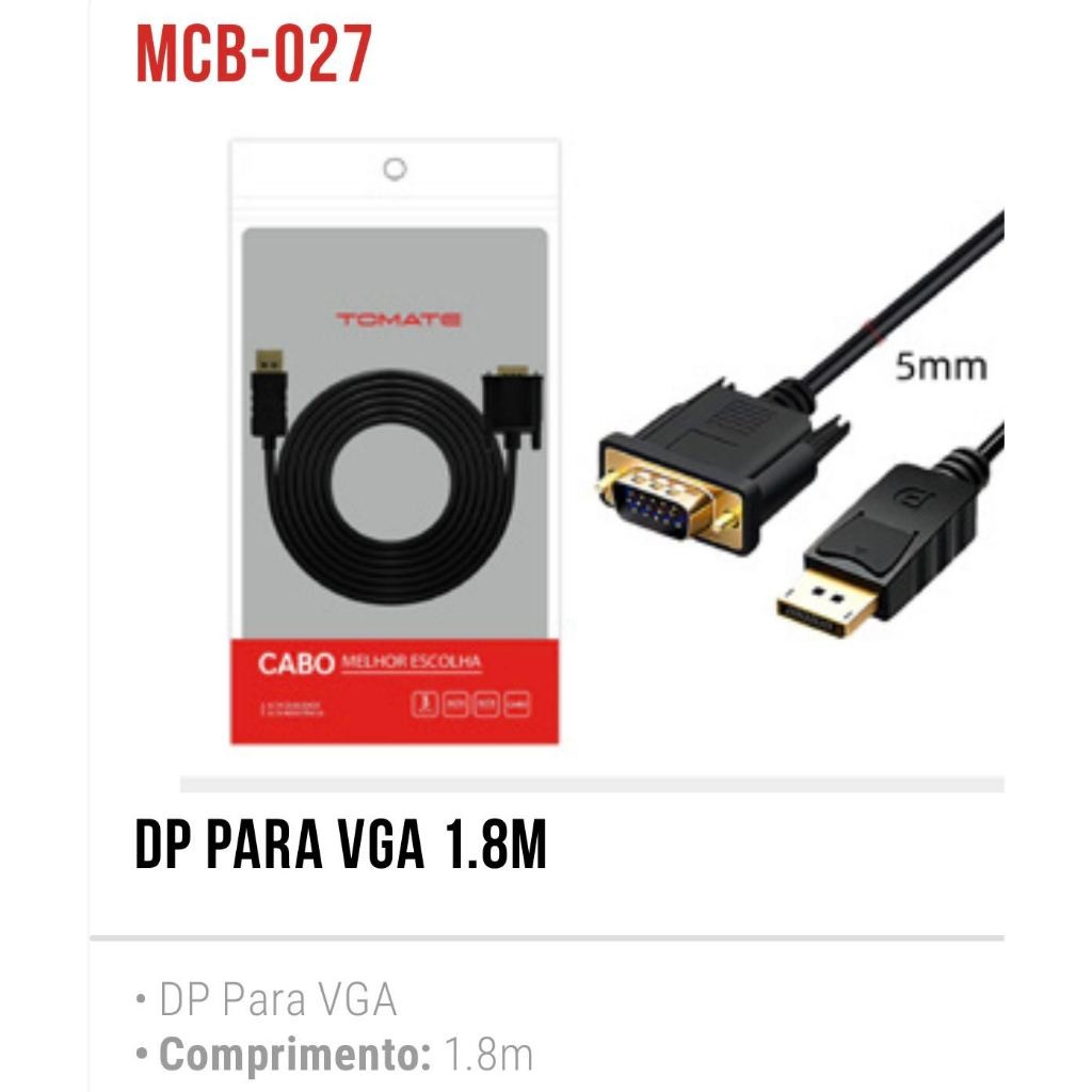A Marca Tomate Cabo Displayport Macho Para Vga Macho 1,80 Metros Transmissão Estável · Imagem HD · Durabilidade Garantida Visão Ultra Nítida, Detalhes Perfeitos Núcleo de cobre puro + dupla blindagem anti-interferência, transmite estável resolução 1920×1200@60Hz com cores vibrantes e sem ghosting. Ideal para apresentações, filmes e jogos em alta definição. Qualidade Premium, Feito para Durar Conectores banhados a ouro resistem à oxidação, capa externa em TPE flexível e anti-dobras. Com 1.8m, adapta-se a ambientes de mesa. Projetado para uso intensivo sem folgas. Compatibilidade Universal, Plug and Play Compatível com PCs, notebooks, projetores, monitores e qualquer dispositivo com porta VGA. Sem necessidade de drivers — perfeito para escritórios, salas de jogos e home theaters. - Suporta VGA analógico resolução de até 1920x1080 (WUXGA), 60Hz - Integrated 10 bits, 162 MHz DAC para a saída de vídeo VGA claro - Plug and Play. Não requer instalação de software - Faixa De Freqüência Vertical: 50/60Hz - Largura de Banda do Amplificador de vídeo: 2.25 Gbps/225 MHz - VGA: 480i / 480p, 576p, 720p, 1080 - Comprimento do cabo: 180 cm - ATI Eyefinity suporte multi-display - Material: ABS shell. - Cor: Preto Informações adicinais: - Aplicações: Conectar Notebook/Desktop com interface de Porta de Exibição para HDTV, Monitor, Projetor, etc com a porta de entrada VGA. Itens Inclusos: - 01 x Cabo Displayport Para VGA