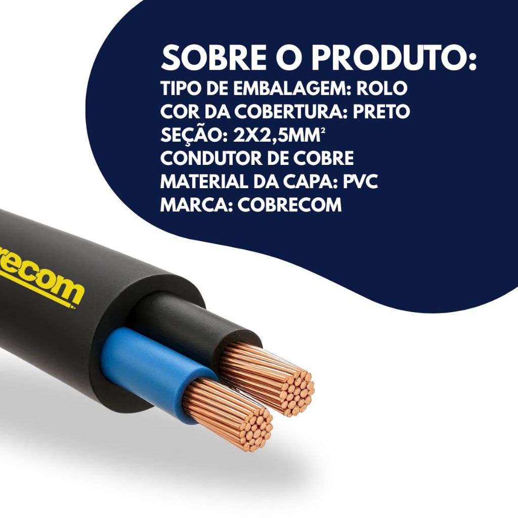 ⚡ Cabo PP 2 x 2,5mm – Cobrecom Original | Flexível | Dupla Isolação | 1 kV 📝 INFORMAÇÃO IMPORTANTE SOBRE A METRAGEM Comprou mais de 1 unidade? O envio será realizado em lances separados, conforme a quantidade adquirida: - 2 unidades de 10 metros = 2 lances de 10 metros - 3 unidades de 10 metros = 3 lances de 10 metros Precisa de outra metragem? Caso deseje uma metragem diferente, envie uma pergunta no anúncio informando a metragem desejada. Nossa equipe irá criar um kit específico conforme a sua necessidade. 📏 Corte mínimo: realizamos cortes a partir de 5 metros. 🔔 Atenção: Sem solicitação prévia, o envio será feito exatamente conforme a descrição do anúncio. O Cabo PP 2 x 2,5mm da Cobrecom é ideal para instalações elétricas que exigem segurança, durabilidade e flexibilidade. Possui dupla isolação e duas vias internas de cobre eletrolítico estanhado, o que proporciona excelente resistência mecânica e proteção contra interferências externas. Perfeito para uso em extensões, ferramentas elétricas, equipamentos industriais, residenciais e comerciais. ✅ Diferenciais do Produto - Marca confiável: Cobrecom Original - Alta resistência: dupla isolação em PVC - Cabo flexível e de fácil manuseio - Indicado para instalações móveis e fixas - Bitola ideal para condução segura: 2,5mm - Tensão máxima: 1 kV - Produto certificado pelo Inmetro 📐 Especificações Técnicas - Tipo: Cabo PP Flexível - Bitola: 2 x 2,5mm² - Condutor: Cobre eletrolítico estanhado - Isolação: PVC dupla camada - Cor da capa: Preta - Tensão nominal: 0,6/1 kV - Norma: NBR NM 247-5 - Aplicação: Extensões, motores, eletrodomésticos, iluminação, entre outros - Uso: Interno e externo (com proteção adequada) ❓ Dúvidas Frequentes 🔌 É ideal para extensões elétricas? ✔️ Sim! Este cabo é amplamente utilizado para montar extensões com segurança. ☀️ Pode ser usado em áreas externas? ✔️ Sim, desde que não fique exposto diretamente ao sol e chuva sem proteção adicional. ⚙️ É resistente ao calor? ✔️ Sim, sua isolação suporta variações térmicas moderadas, ideal para uso elétrico residencial e industrial. Imagens Ilustrativas
