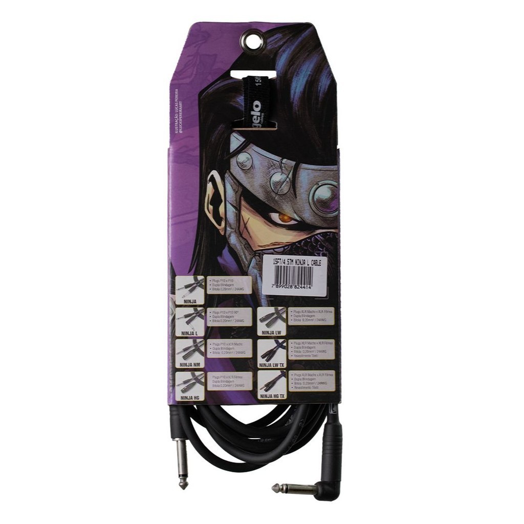 Cabo Santo Angelo P10 X P10 L 9,10 metros * Série Ninja * Ideal p/ violão, guitarra, contrabaixo, teclado, mesa de som e áudio em geral * Fabricado com liga de cobre OFHC (Isenta de Oxigênio) e bitola de 0,20mm²/24AWG (E20). * Montado com conectores P10 x P10 usinados em latão (CLA) niquelados e blindados com thermocontrátil. * Blindagem : Cobre espiralado * Material : PVC * Bitola mm²: 0,20mm² * Bitola AWG : 24AWG * Tipo do plugue : Latão * Material do plugue : P10 mono