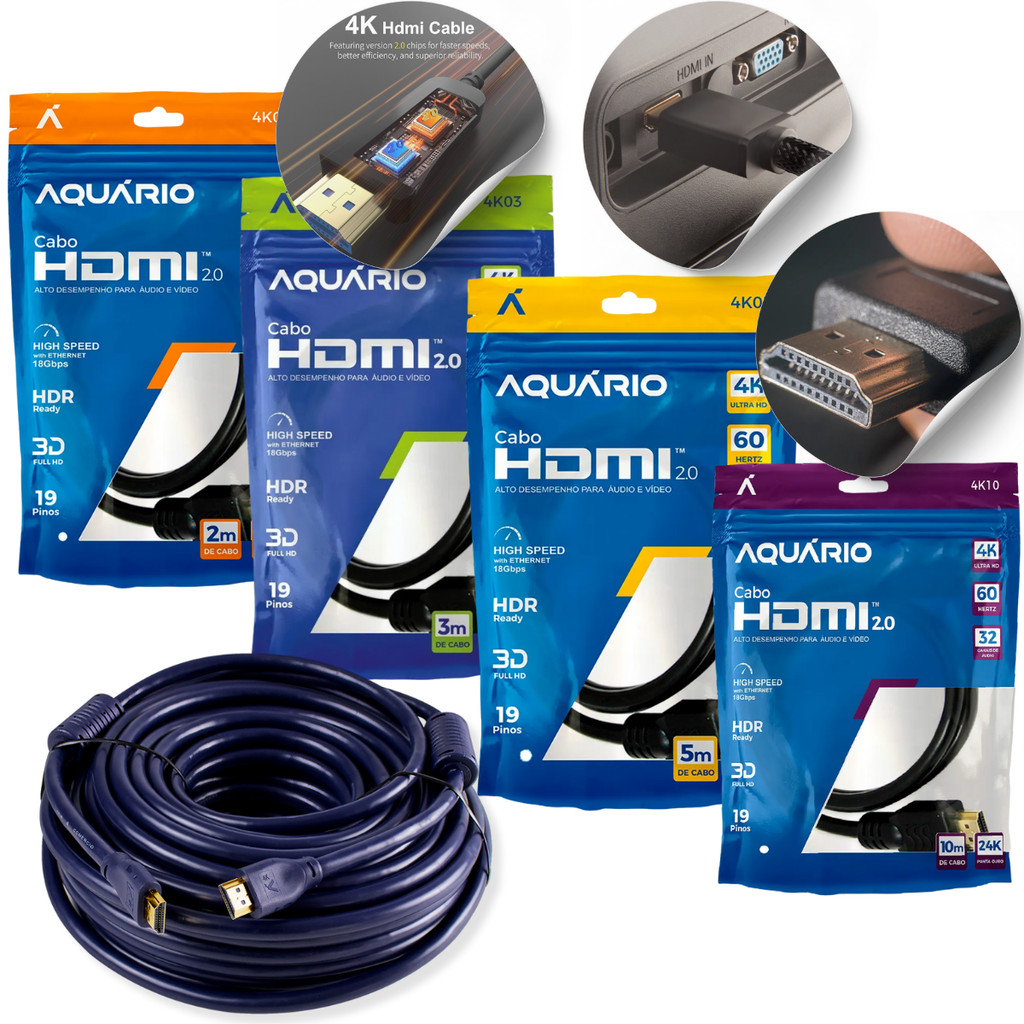 Cabo HDMI 2.0 4K E 2.1 8K Aquário Gold Blindado 2m 5m 10m Alta Velocidade