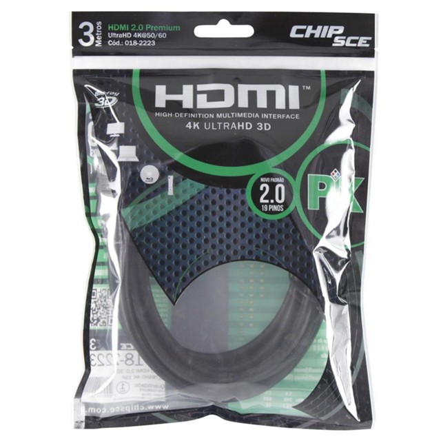. Marca: Chip SCE Modelo: 018-2223 Tamanho: Cabo de 3 Metros - Compatibilidade: PCM, DVD-Áudio, Super Áudio CD, Dolby True HD, DTS-HD Master Áudio. - Conectividade: TVs LED, LCD e Plasma, monitores, digitais, projetores, consoles de videogame, etc. - 3D: Compatível com todos os formatos atuais de 3D. - Ecológico: em conformidade com RoHS, seguro para o meio ambiente e para você. - Compatível com proporção de cinema 21:9 - Som perfeito: frequência de áudio até 1536Khz - Transmissão de 4 canais de áudio simultâneos - Sinal: de Vídeo Suporta resolução de 576i/p, 720i/p, 1080i/p e 2160p. - Comprimento: 3 Metros - Canal Ethernet ::Imagens.