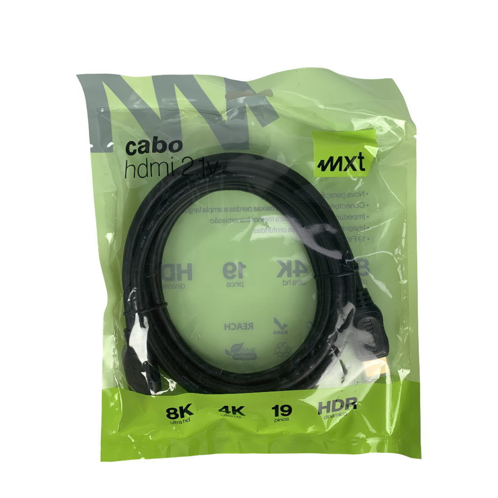 HDMI 2.1 DINÂMICO DOURADO Especificações: • Comprimento: 3 metros • Alta velocidade • 19 pinos • Condutor de cobre, revestimento em PVC • Compatível com versões anteriores 2.0 1.4, 1.3B e 1.3 • O.D: 6.4MM