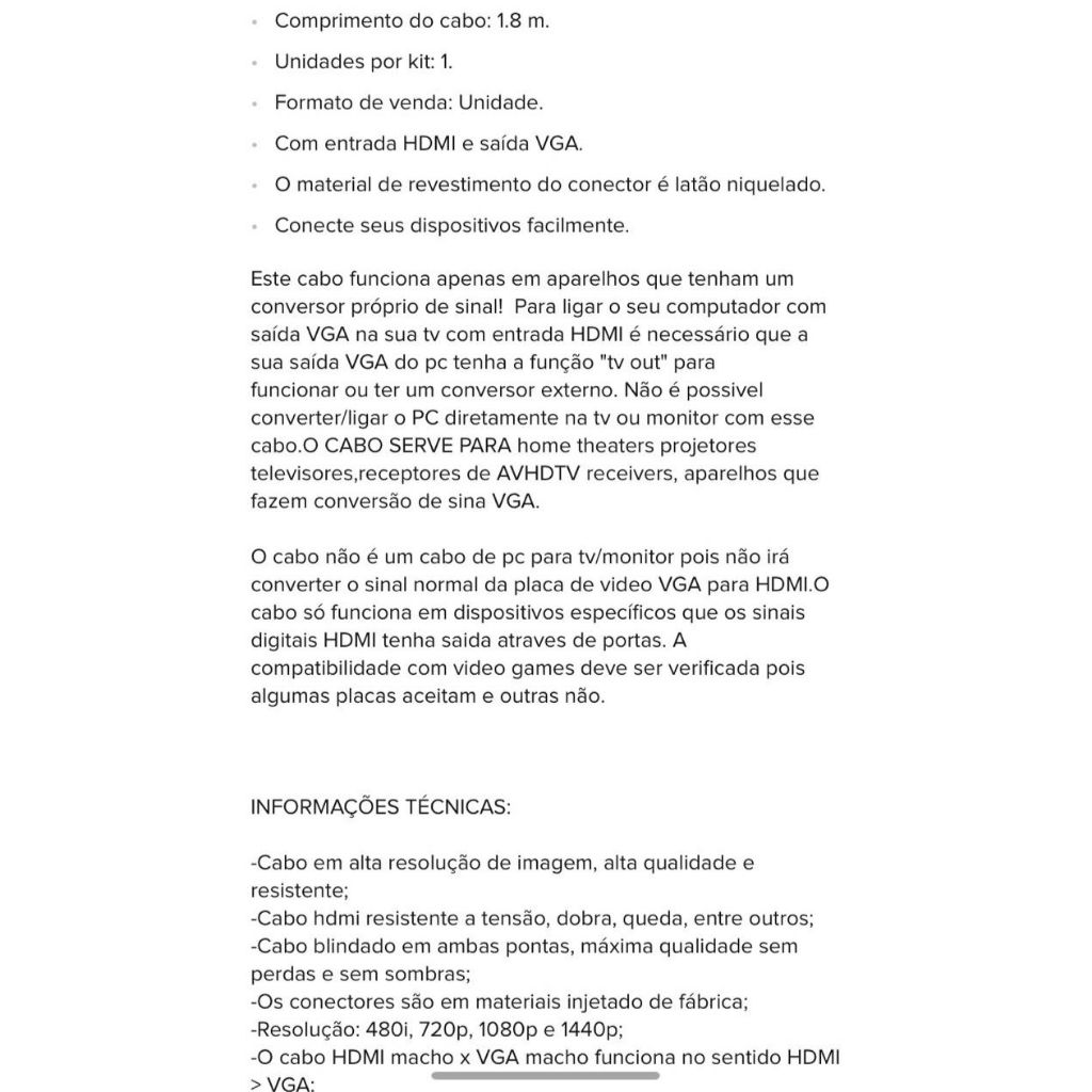 | Cabo HDMI para VGA 1.8m It-Blue LE-6619 Conector HDMI/VGA ATENÇÃO N... este produto | R$ 34,99 | — | 4.0/5 | 20 |