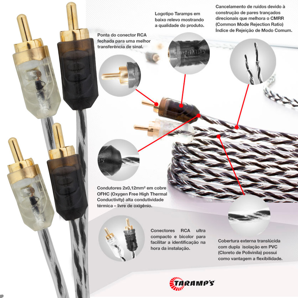 Cabo RCA Som Automotivo 5 Metros Injetado Flexível Transparente Taramps Conectores Pressão Plug 3mm 5mts As conexões do seu projeto de som merecem tanto cuidado quanto os próprios alto falantes e módulos de som. Para isso, a Taramps fornece mais um componente de qualidade para o seu som, o Cabo RCA Paralelo de 5 metros. Fabricado com filamento de cobre 99,99% OFC (livre de oxigênio), esse cabo duplo proporciona uma ótima condutividade sem esquentar e com baixíssimo nível de interferência. O cabo RCA tem 3mm de espessura e revestimento primário preto e transparente. O cabo recebe ainda outra camada externa em PVC transparente para melhor proteção do filamento interno. Os conectores de pressão banhados à ouro mantém a ligação firme e o sinal limpo de ponta a ponta. Características: - Conectores de Pressão - Capacidade de Condução com Fio de Cobre 99,99% OFC - Isolamento Dielétrico com Excelente Blindagem - 5 metros de Comprimento por 3mm de Espessura - Revestimento em PVC Transparente • Isolamento Dielétrico Elemento principal de um cabo, pois a onda eletromagnética caminha no interior do dielétrico ao ser transmitido um sinal pelo condutor interno Constituído de PVC irradiado para sinais de frequência, suporta temperaturas elevadas com moderação • Condutor Externo (Blindagem) O cabo RCA de pares trançados, combinam as técnicas de blindagem e cancelamento. Este tipo de cabo RCA possui pares de fios entrelaçados um ao redor do outro para cancelar as interferências eletromagnéticas de fontes externas e interferências de cabos vizinhos O cabos de pares trançados possuem eficiência no cancelamento de ruídos devido à construção de pares trançados direcionais que melhora o CMRR (Common Mode Rejection Ratio) Índice de Rejeição de Modo Comum • Capa ou cobertura externa Cobertura externa translucida, fornece a proteção do cabo contra o meio externo PVC (Cloreto de polivinila) – possui como vantagem a flexibilidade • Conectores Conector RCA ultra compacto e bicolor para facilitar a identificação e ótima condução de sinal devido a sua construção continua com o cabo Fabricado de latão CLA banhado em ouro industrial se tornando um ótimo condutor, possui cavidades com pressão e ponta fechada para uma melhor transferência de sinal • Conteúdo da embalagem 1 Cabo RCA Taramps Plus Injetado de 5 Metros IMPORTANTE: A Loja do Som e Acessórios recomenda que a instalação seja feita por profissional especializado e não se responsabiliza pelo mau uso do produto. [DÚVIDAS FREQUENTES] • Como funciona a garantia? R: Nossos produtos têm uma etiqueta de garantia para nosso controle interno, com essa etiqueta identificamos a validade da garantia , portanto NÃO tire a etiqueta do produto. • O produto está disponível a pronta entrega? R: Sim, todos os nossos produtos estão no nosso estoque preparado para ser embalado e enviado pra você!