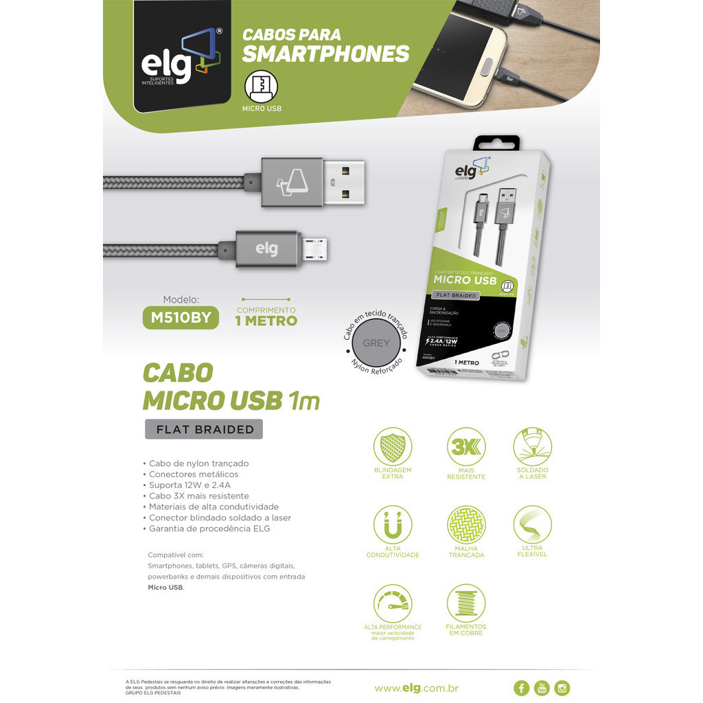 Velocidade, segurança e durabilidade: sua recarga com potência máxima. O Cabo Micro USB ELG M510BY foi desenvolvido para quem busca praticidade, estilo e resistência em um único acessório. Com 1 metro de comprimento e design flat slim em tecido reforçado de nylon trançado, evita emaranhados, garante maior resistência a flexões constantes e auxilia na organização do dia a dia. Seus conectores metálicos em alumínio anodizado proporcionam mais segurança, durabilidade e acabamento sofisticado na cor Cinza, combinando robustez e visual moderno. Compatível com smartphones, tablets, GPS, HDs externos, câmeras digitais, powerbanks e outros dispositivos com entrada Micro USB, suporta corrente de até 2.4A e potência de até 12W, assegurando recarga rápida, estável e sincronização de dados com alta performance. Características Técnicas: Compatibilidade: smartphones e dispositivos com conector Micro USB Comprimento: 1 metro Conector: Micro USB metálico blindado Cor: Cinza Corrente: 2.4A Potência: 12W Fabricação: conectores metálicos em alumínio e cabo flat slim em nylon trançado reforçado Extras: materiais de alta condutividade, blindagem extra, conector soldado a laser, cabo super reforçado, alta performance com maior velocidade de carregamento IMPORTANTE :: As imagens dos produtos são meramente ilustrativas e podem apresentar pequenas variações de cor ou acabamento, conforme iluminação, resolução do monitor ou percepção visual. :: Objetos de decoração e itens adicionais exibidos nas fotos não acompanham o produto. :: Todas as informações técnicas e características dos produtos são de responsabilidade da marca ELG, podendo sofrer alterações sem aviso prévio. :: Os pedidos são sempre enviados de forma completa. Caso haja produtos com prazos de postagem diferentes, será considerado o maior prazo para envio do pedido. :: Valores e condições podem ser alterados sem aviso prévio e são válidos exclusivamente para compras realizadas neste site. :: A garantia ELG é limitada ao produto e não cobre danos ocasionados por mau uso, instalação incorreta ou manuseio inadequado. SOBRE A ELG: A ELG é uma empresa brasileira que preza pela alta qualidade. Nossa política é aplicada em toda linha de produtos e garante que os consumidores possam adquirir itens que foram amplamente testados.