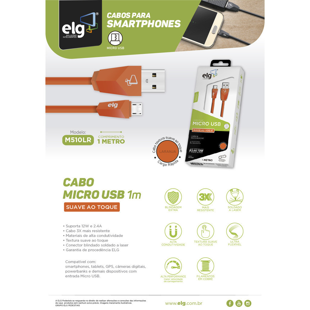 Velocidade, segurança e durabilidade: sua recarga com potência máxima. O Cabo Micro USB ELG M510LR foi projetado para oferecer praticidade, desempenho e resistência em seu uso diário. Com 1 metro de comprimento e design compacto, é ideal para manter seus dispositivos sempre carregados e conectados. Produzido em PVC injetado de alta durabilidade com conectores metálicos blindados e soldados a laser, garante maior robustez, blindagem contra interferências e segurança durante o uso. Compatível com smartphones, tablets, GPS, HDs externos, câmeras digitais, powerbanks e outros dispositivos com entrada Micro USB, o M510LR suporta corrente de até 2.4A e potência de até 12W, proporcionando recarga rápida, transferência de dados estável e sincronização eficiente. Características Técnicas: Compatibilidade: smartphones e dispositivos que possuam conector Micro USB Comprimento: 1 metro Conector: Micro USB metálico blindado Cor: Laranja Corrente: 2.4A Potência: 12W Fabricação: conectores metálicos e cabo em PVC injetado de alta resistência Extras: materiais de alta condutividade, blindagem extra, conector soldado a laser, alta performance com maior velocidade de carregamento IMPORTANTE :: As imagens dos produtos são meramente ilustrativas e podem apresentar pequenas variações de cor ou acabamento, conforme iluminação, resolução do monitor ou percepção visual. :: Objetos de decoração e itens adicionais exibidos nas fotos não acompanham o produto. :: Todas as informações técnicas e características dos produtos são de responsabilidade da marca ELG, podendo sofrer alterações sem aviso prévio. :: Os pedidos são sempre enviados de forma completa. Caso haja produtos com prazos de postagem diferentes, será considerado o maior prazo para envio do pedido. :: Valores e condições podem ser alterados sem aviso prévio e são válidos exclusivamente para compras realizadas neste site. :: A garantia ELG é limitada ao produto e não cobre danos ocasionados por mau uso, instalação incorreta ou manuseio inadequado. SOBRE A ELG: A ELG é uma empresa brasileira que preza pela alta qualidade. Nossa política é aplicada em toda linha de produtos e garante que os consumidores possam adquirir itens que foram amplamente testados.